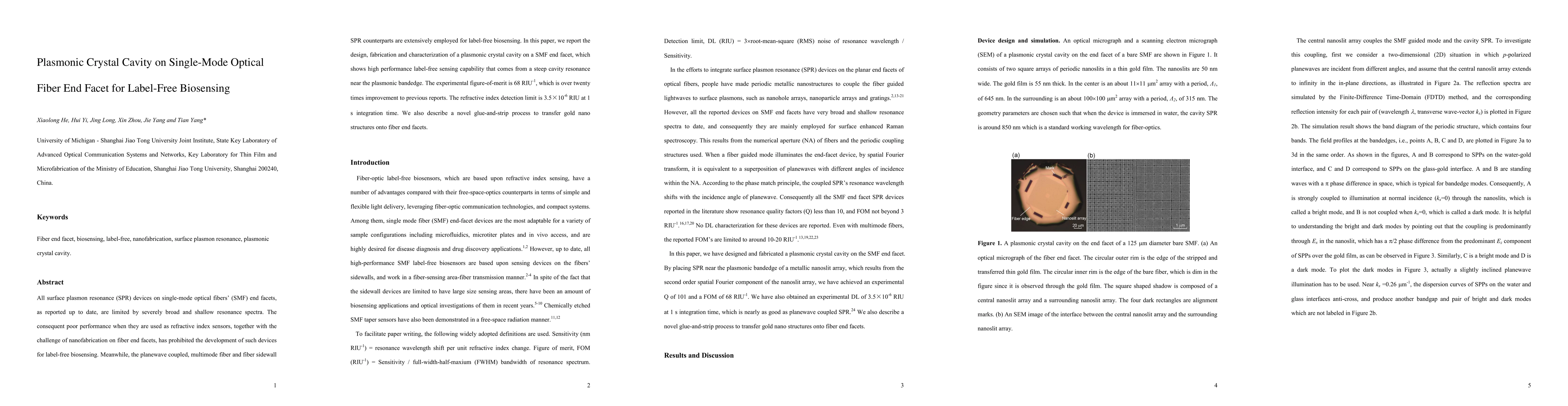 This paper presents a novel plasmonic crystal cavity on a single-mode optical fiber end facet, achieving significantly improved label-free biosensing performance with a steep cavity resonance and a detection limit of 3.5*10^-6 RIU. The study also introduces a new glue-and-strip method for transferring gold nanostructures onto fiber facets.