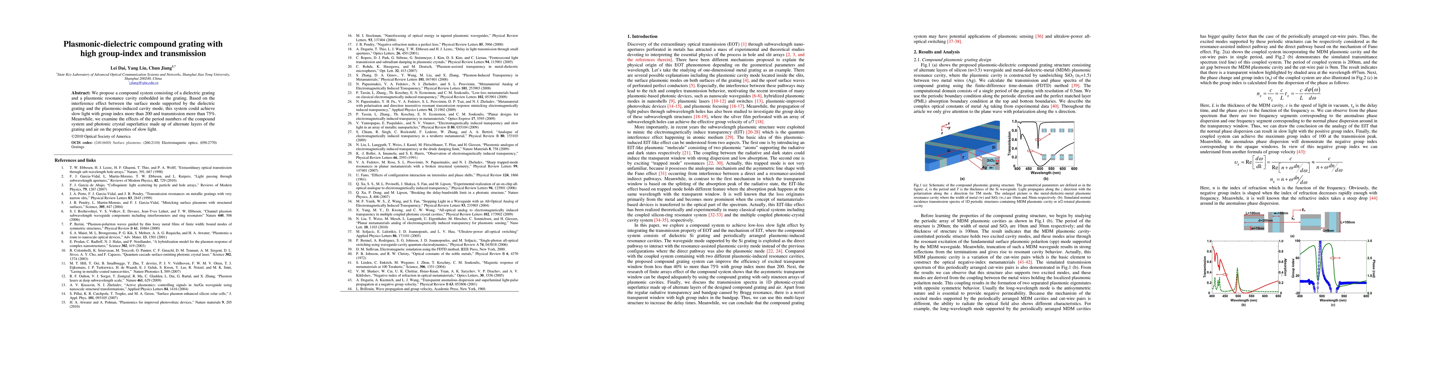 This paper proposes a compound grating system combining dielectric and plasmonic elements to achieve slow light with a high group index over 200 and transmission exceeding 75%. The study also investigates the influence of the grating's period and photonic crystal superlattice structures on the slow light properties.