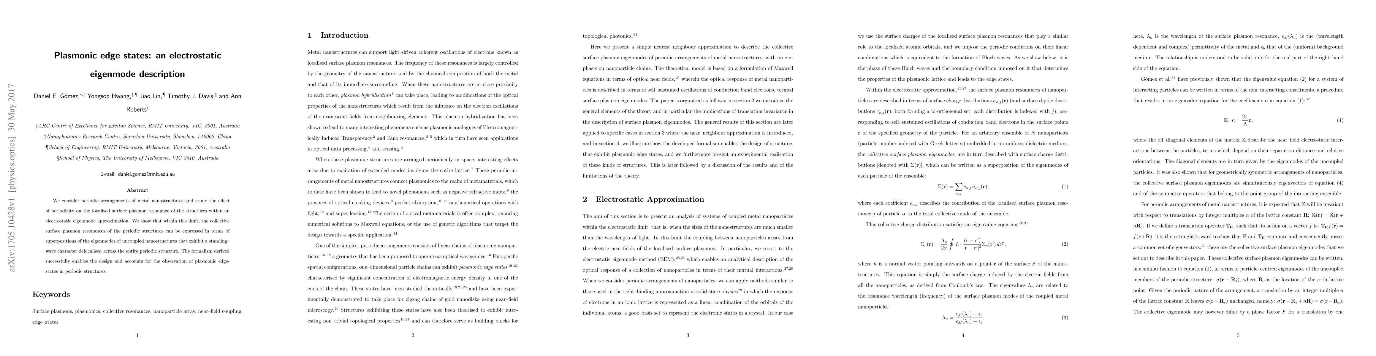 This paper explores the localized surface plasmon resonance in periodic metal nanostructures using an electrostatic eigenmode approximation, demonstrating that collective resonances can be described as superpositions of uncoupled nanostructures' eigenmodes, leading to standing-wave plasmonic edge states.