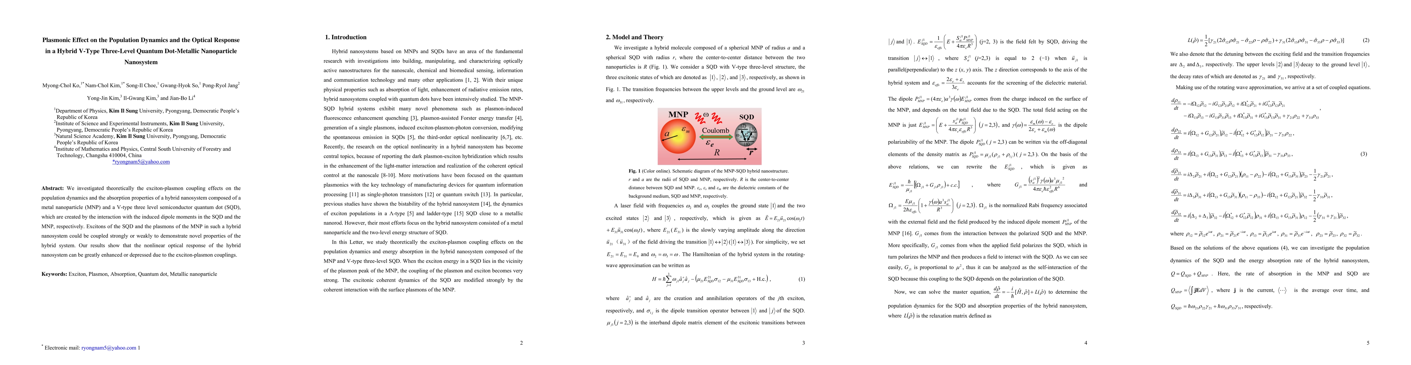 This paper explores the theoretical exciton-plasmon interactions in a hybrid V-type quantum dot-metallic nanoparticle system, revealing how these couplings can significantly enhance or suppress the nonlinear optical response. The study highlights the potential for novel dynamic and optical properties in such nanosystems.