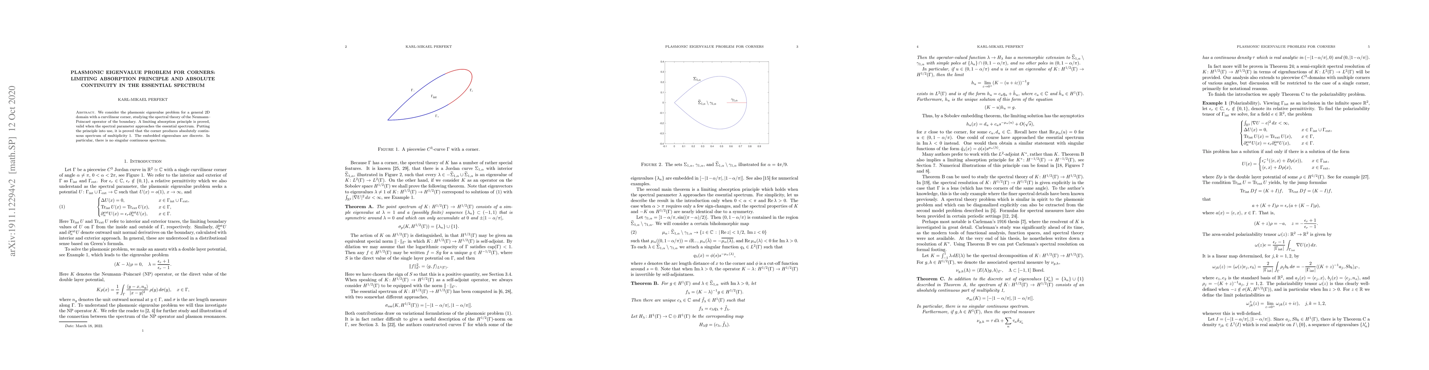 We consider the plasmonic eigenvalue problem for a general 2D domain with a curvilinear corner, studying the spectral theory of the Neumann--Poincar\'e operator of the boundary. A limiting absorption principle is proved, valid when the spectral parameter approaches the essential spectrum. Putting the principle into use, it is proved that the corner produces absolutely continuous spectrum of multiplicity 1. The embedded eigenvalues are discrete. In particular, there is no singular continuous spectrum.