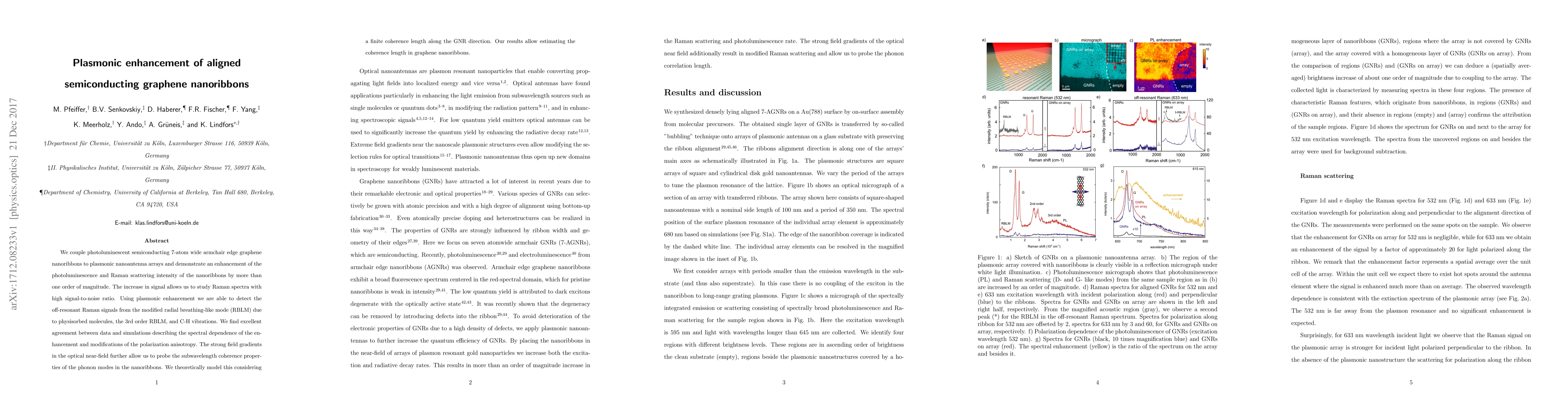 This paper demonstrates a significant enhancement of photoluminescence and Raman scattering in semiconducting graphene nanoribbons when coupled with plasmonic nanoantenna arrays, enabling high-resolution Raman spectroscopy and revealing subwavelength coherence properties of phonon modes. The study also estimates the coherence length in graphene nanoribbons through theoretical modeling.