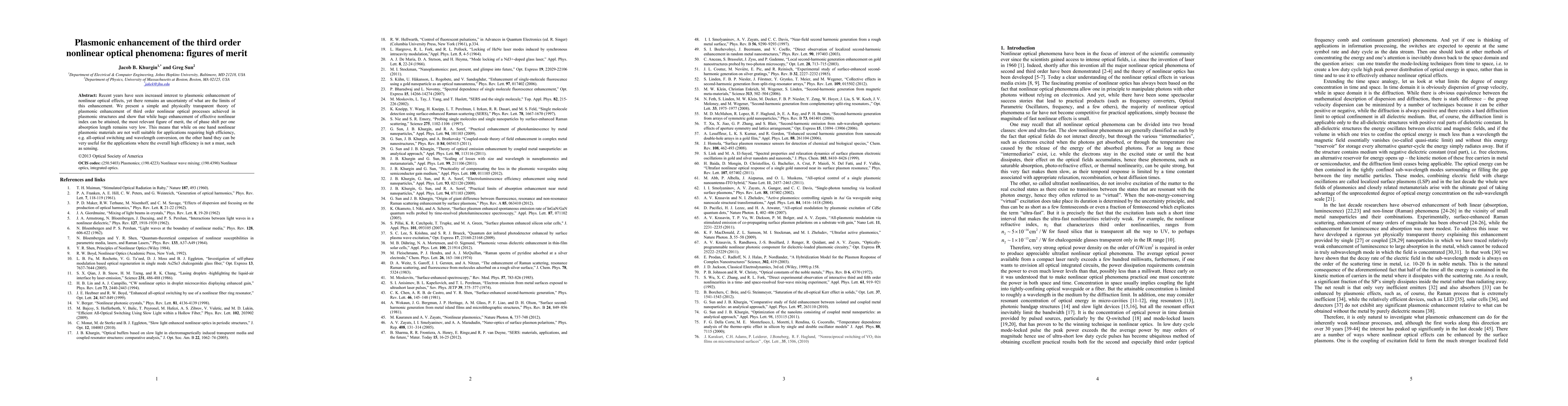 Recent years have seen increased interest to plasmonic enhancement of nonlinear optical effects, yet there remains an uncertainty of what are the limits of this enhancement. We present a simple and physically transparent theory of plasmonic enhancement of third order nonlinear optical processes achieved in plasmonic structures and show that while huge enhancement of effective nonlinear index can be attained, the most relevant figure of merit, the of phase shift per one absorption length remains very low. This means that while on one hand nonlinear plasmonic materials are not well suitable for applications requiring high efficiency, e.g. all-optical switching and wavelength conversion, on the other hand they can be very useful for the applications where the overall high efficiency is not a must, such as sensing.