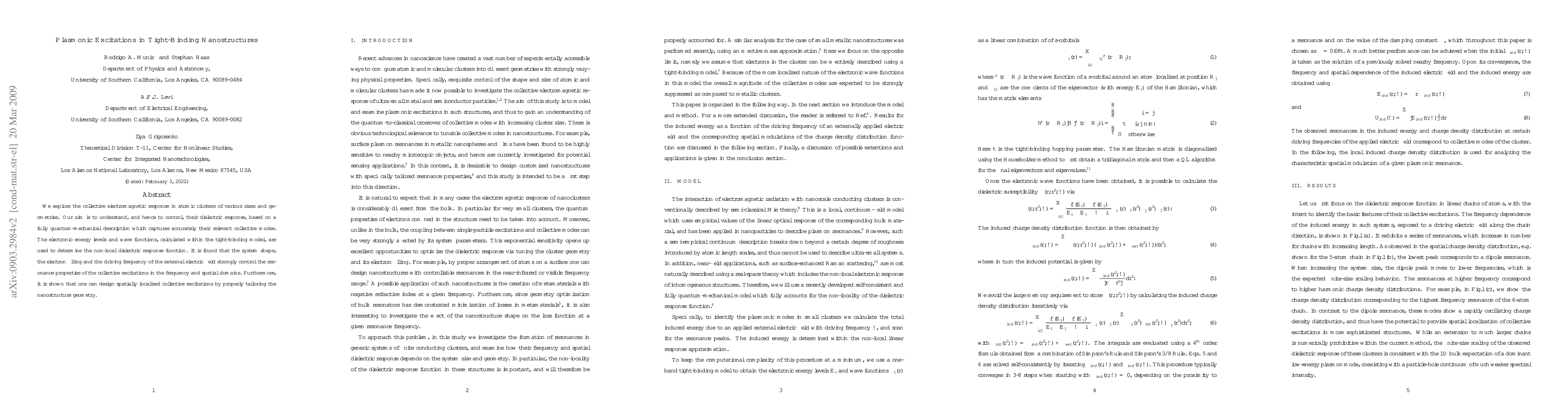 This paper investigates the collective electromagnetic response in atomic clusters using a tight-binding model, revealing that the system's shape, electron filling, and external field frequency significantly influence resonance properties. The study demonstrates the ability to design spatially localized collective excitations through precise nanostructure geometry manipulation.