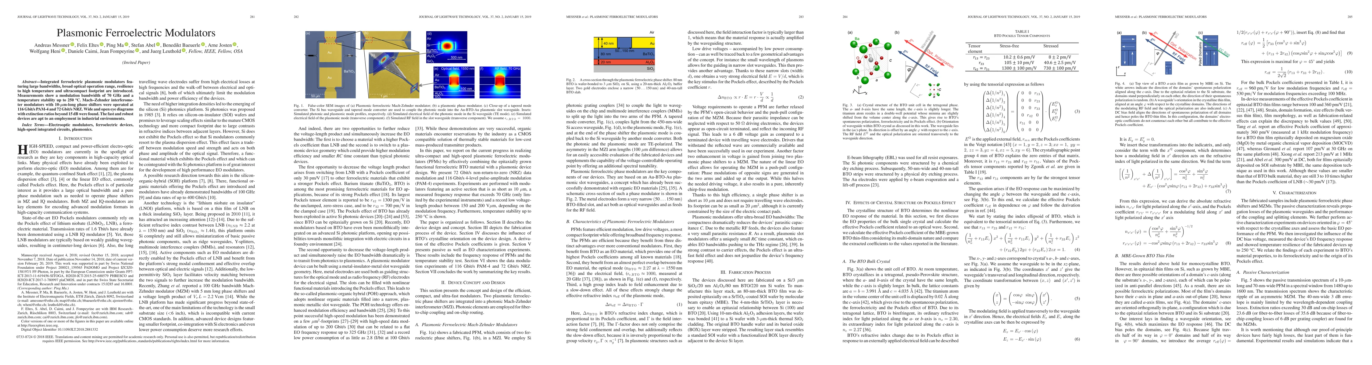 This paper introduces integrated ferroelectric plasmonic modulators with large bandwidths, high temperature stability, and compact size. The devices demonstrated 70 GHz modulation bandwidth and operated reliably up to 250°C, making them suitable for industrial applications.