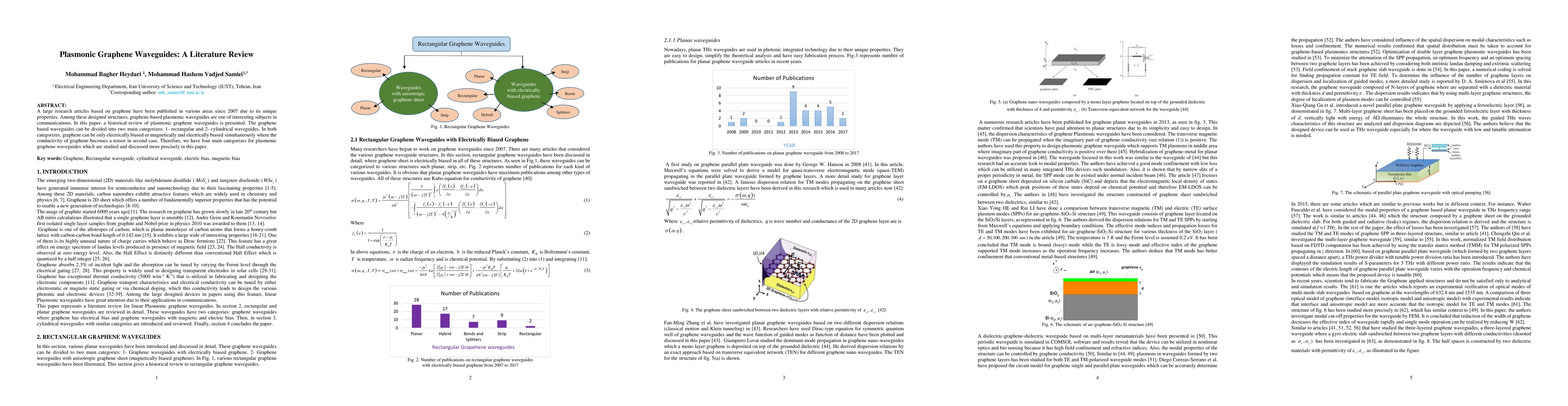 This literature review explores the development of plasmonic graphene waveguides, categorizing them into rectangular and cylindrical types, and discusses their operation under electric and magnetic biases, highlighting the tensor nature of graphene's conductivity in the latter case.