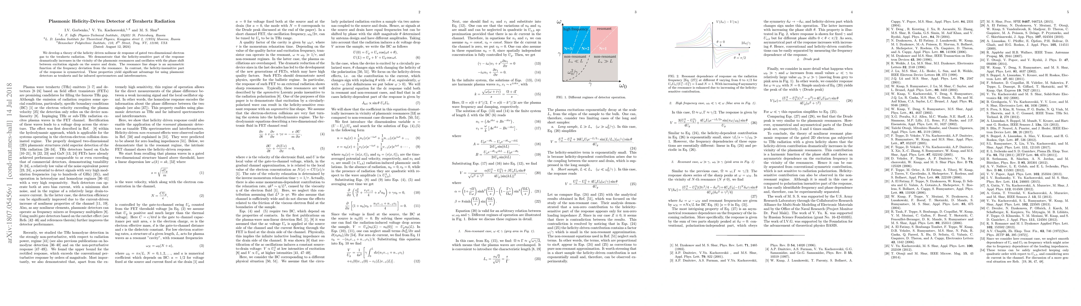 This paper presents a theoretical framework for a helicity-driven nonlinear detector using gated two-dimensional electron gas exposed to terahertz radiation, showing that the helicity-sensitive response significantly enhances near plasmonic resonances, offering advantages for terahertz spectrometers and interferometers. The helicity-sensitive response is asymmetric, while the helicity-insensitive part remains symmetrical.