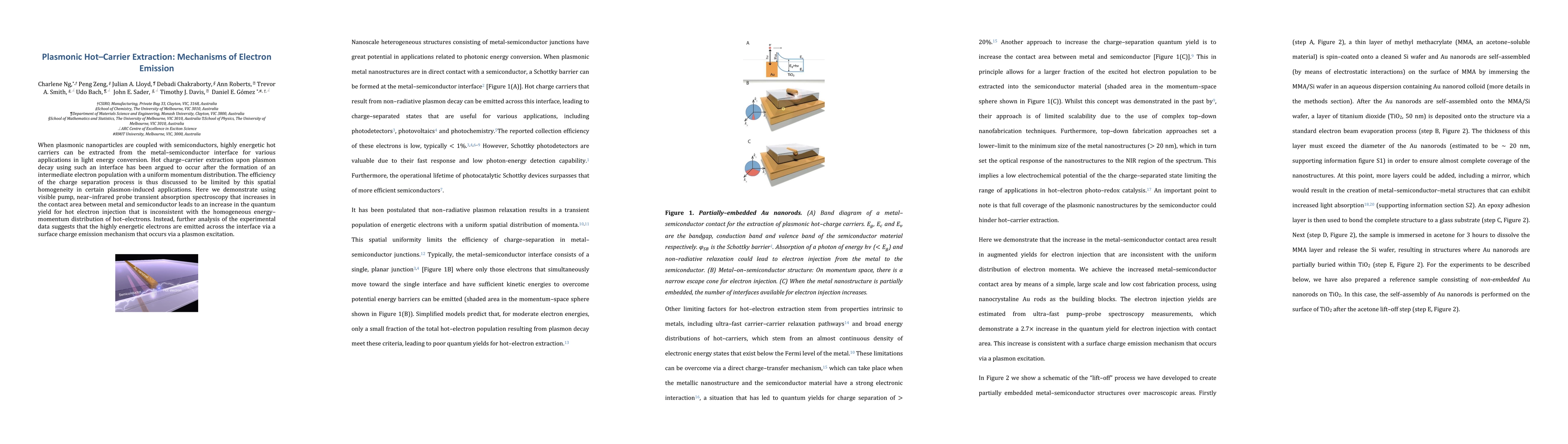 This paper investigates the extraction of highly energetic hot carriers from plasmonic nanoparticles coupled with semiconductors. Contrary to previous assumptions of a uniform momentum distribution, the study reveals that increased contact area enhances quantum yield, suggesting a surface charge emission mechanism driven by plasmon excitation.