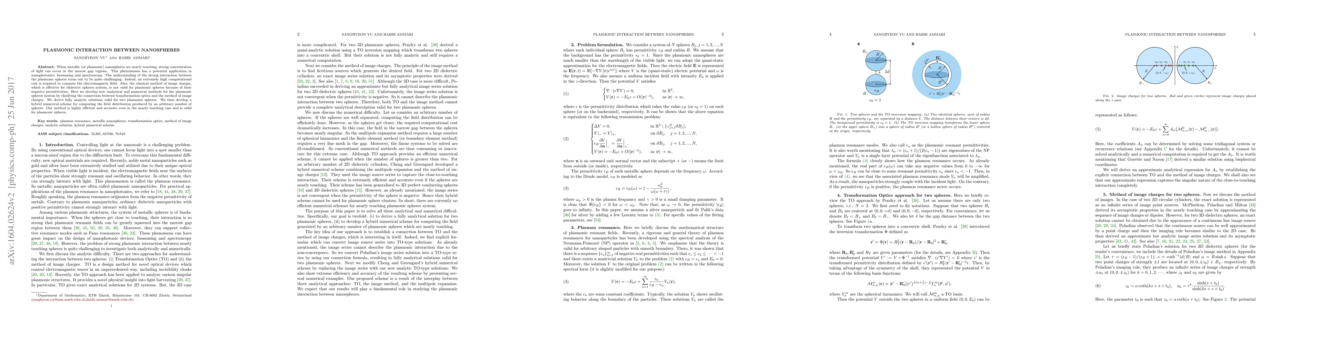 This paper develops new analytical and numerical methods to understand the strong plasmonic interactions between nearly touching metallic nanospheres, addressing the high computational cost and limitations of classical image charge methods. The proposed methods provide efficient and accurate solutions for electromagnetic field distributions in plasmonic sphere systems.