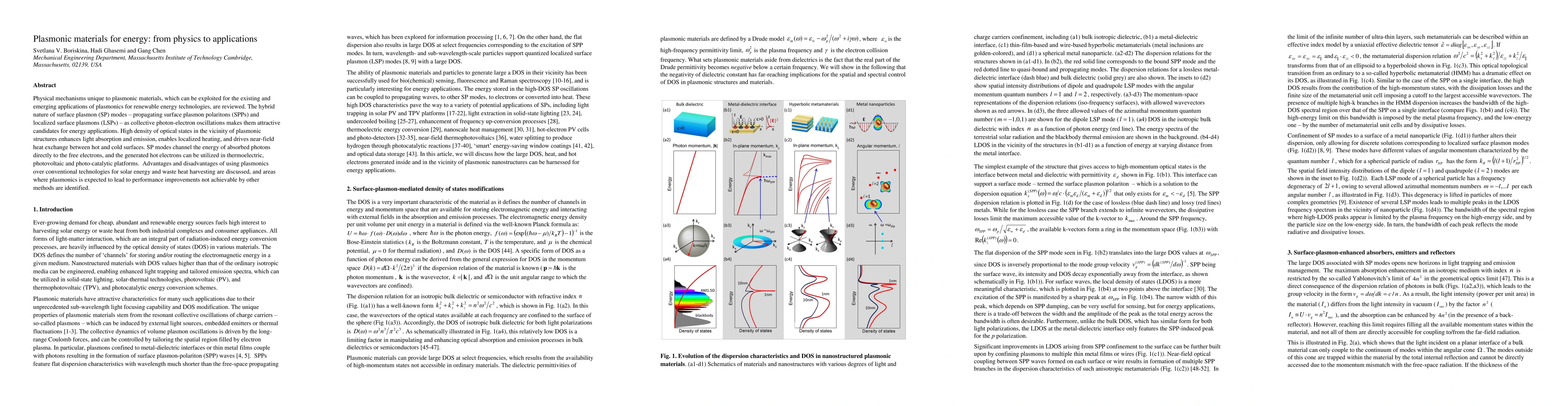 Physical mechanisms unique to plasmonic materials, which can be exploited for the existing and emerging applications of plasmonics for renewable energy technologies, are reviewed. The hybrid nature of surface plasmon (SP) modes - propagating surface plasmon polaritons (SPPs) and localized surface plasmons (LSPs) - as collective photon-electron oscillations makes them attractive candidates for energy applications. High density of optical states in the vicinity of plasmonic structures enhances light absorption and emission, enables localized heating, and drives near-field heat exchange between hot and cold surfaces. SP modes channel the energy of absorbed photons directly to the free electrons, and the generated hot electrons can be utilized in thermoelectric, photovoltaic and photo-catalytic platforms. Advantages and disadvantages of using plasmonics over conventional technologies for solar energy and waste heat harvesting are discussed, and areas where plasmonics is expected to lead to performance improvements not achievable by other methods are identified.