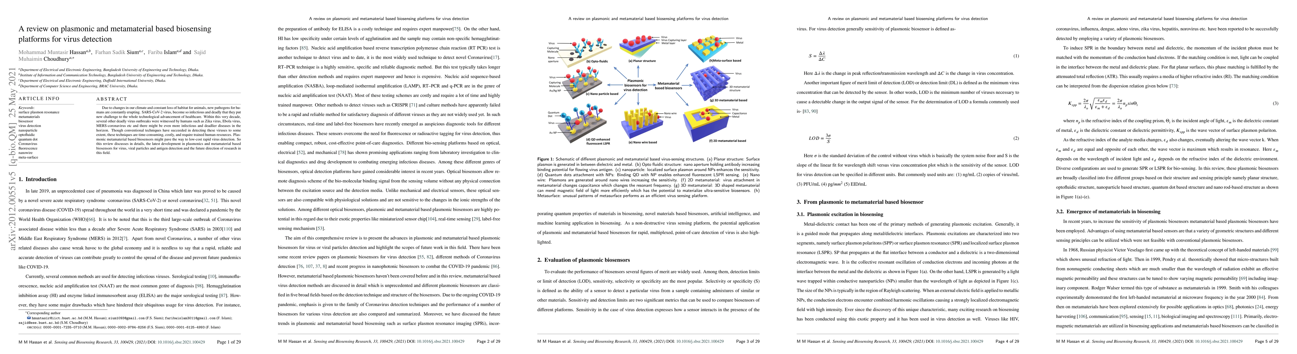 Our atmosphere is constantly changing and new pathogens are erupting now and then and the existing pathogens are mutating continuously. Some of these pathogens, such as SARS-CoV-2, become so deadly that they put the whole technological advancement of healthcare under challenge. Within this very decade several other deadly virus outbreaks were witnessed by humans such as Zika virus, Ebola virus, MERS-coronavirus etc. Though conventional techniques have succeeded in detecting these viruses to some extent, these techniques are time-consuming, costly, and require trained human-resources. Plasmonic metamaterial-based biosensors might pave the way to low-cost rapid virus detection. So this review discusses in details the latest development in plasmonics and metamaterial-based biosensors for virus, viral particles and antigen detection and the future direction of research in this field. Emergence of quantum properties in biosensing, application of machine learning, artificial intelligence and novel materials in biosensing is also discussed in brief.