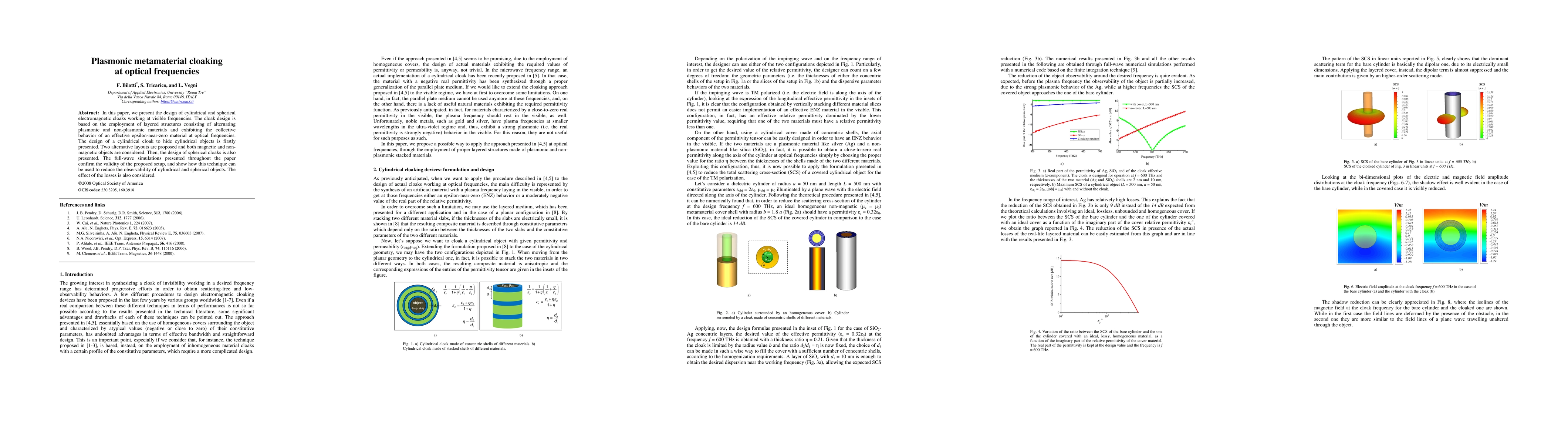 This paper designs cylindrical and spherical electromagnetic cloaks for optical frequencies using layered structures of plasmonic and non-plasmonic materials. Full-wave simulations validate the cloaks' effectiveness in hiding objects, considering both magnetic and non-magnetic materials, and addressing the impact of losses.