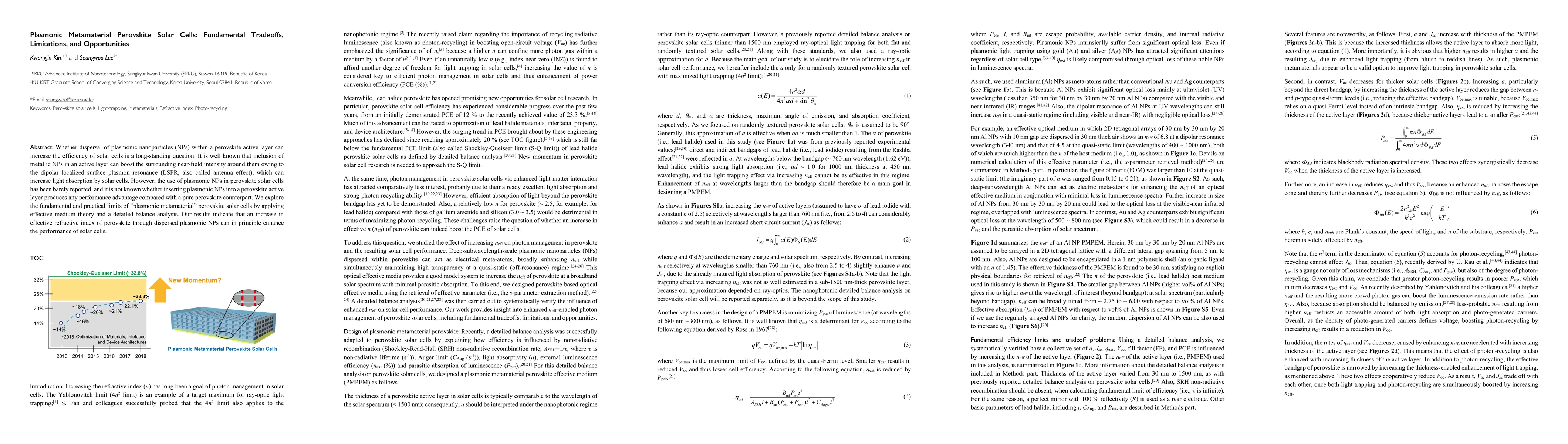 Whether dispersal of plasmonic nanoparticles (NPs) within a perovskite active layer can increase the efficiency of solar cells is a long-standing question. It is well known that inclusion of metallic NPs in an active layer can boost the surrounding near-field intensity around them owing to the dipolar localized surface plasmon resonance (LSPR, also called antenna effect), which can increase light absorption by solar cells. However, the use of plasmonic NPs in perovskite solar cells has been barely reported, and it is not known whether inserting plasmonic NPs into a perovskite active layer produces any performance advantage compared with a pure perovskite counterpart. We explore the fundamental and practical limits of plasmonic metamaterial perovskite solar cells by applying effective medium theory and a detailed balance analysis. Our results indicate that an increase in effective refractive index of perovskite through dispersed plasmonic NPs can in principle enhance the performance of solar cells.