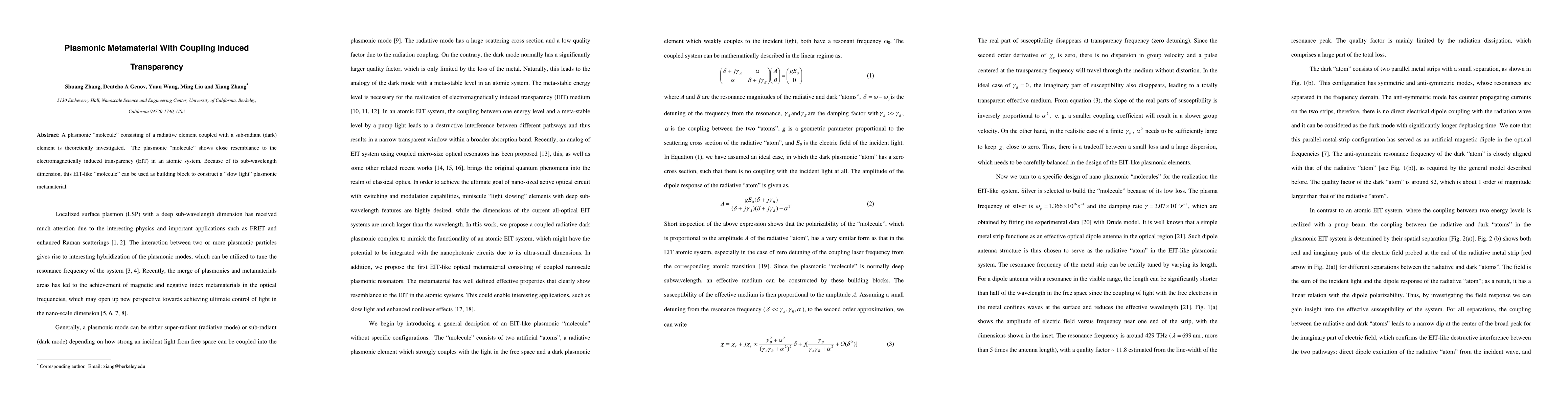 This paper investigates a plasmonic "molecule" where a radiative element is coupled with a sub-radiant element, mimicking electromagnetically induced transparency (EIT) in atomic systems. This EIT-like structure, due to its sub-wavelength size, serves as a building block for constructing "slow light" plasmonic metamaterials.