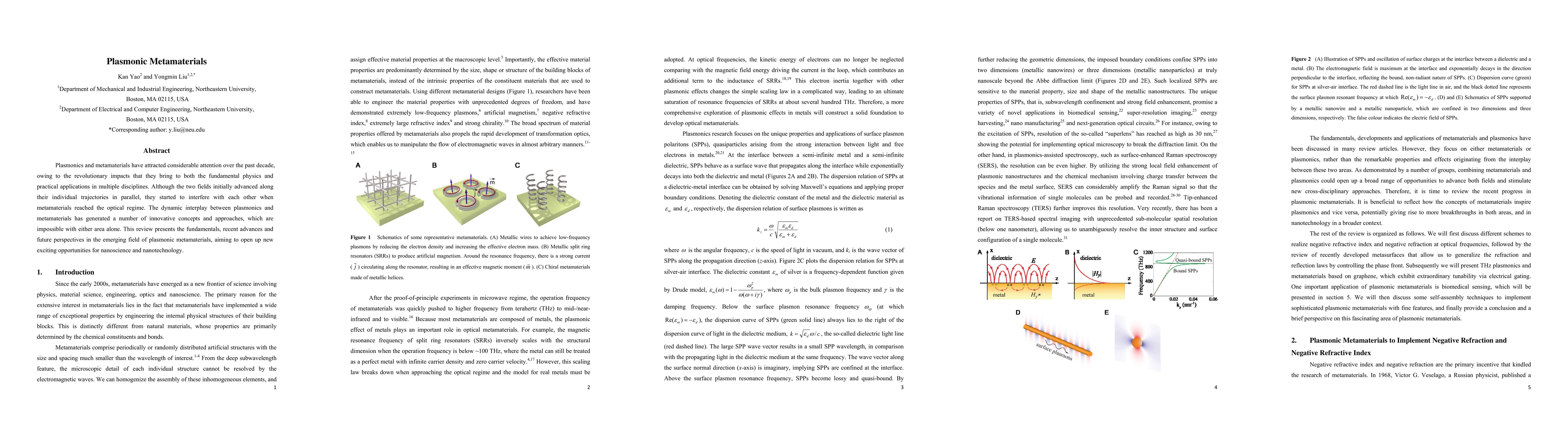 Plasmonics and metamaterials have attracted considerable attention over the past decade, owing to the revolutionary impacts that they bring to both the fundamental physics and practical applications in multiple disciplines. Although the two fields initially advanced along their individual trajectories in parallel, they started to interfere with each other when metamaterials reached the optical regime. The dynamic interplay between plasmonics and metamaterials has generated a number of innovative concepts and approaches, which are impossible with either area alone. This review presents the fundamentals, recent advances and future perspectives in the emerging field of plasmonic metamaterials, aiming to open up new exciting opportunities for nanoscience and nanotechnology.