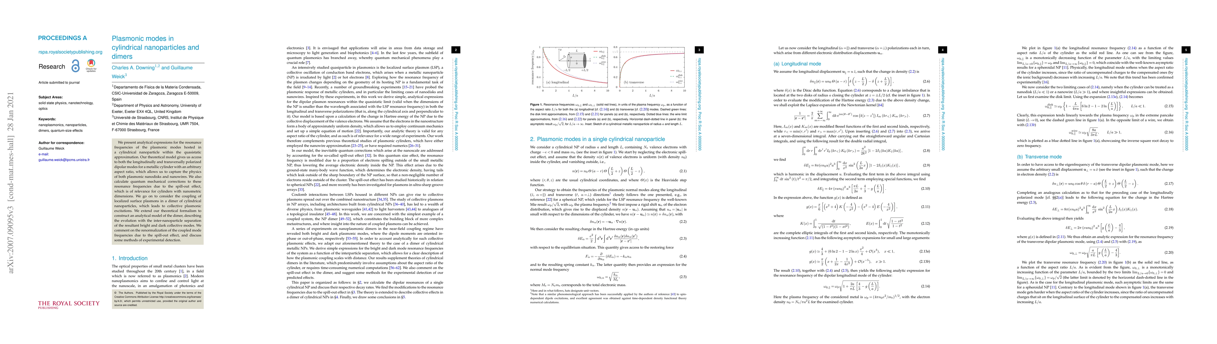 The paper's main technical contribution is the development of analytical expressions for plasmonic modes in cylindrical nanoparticles and dimers, including quantum corrections for spill-out effects.