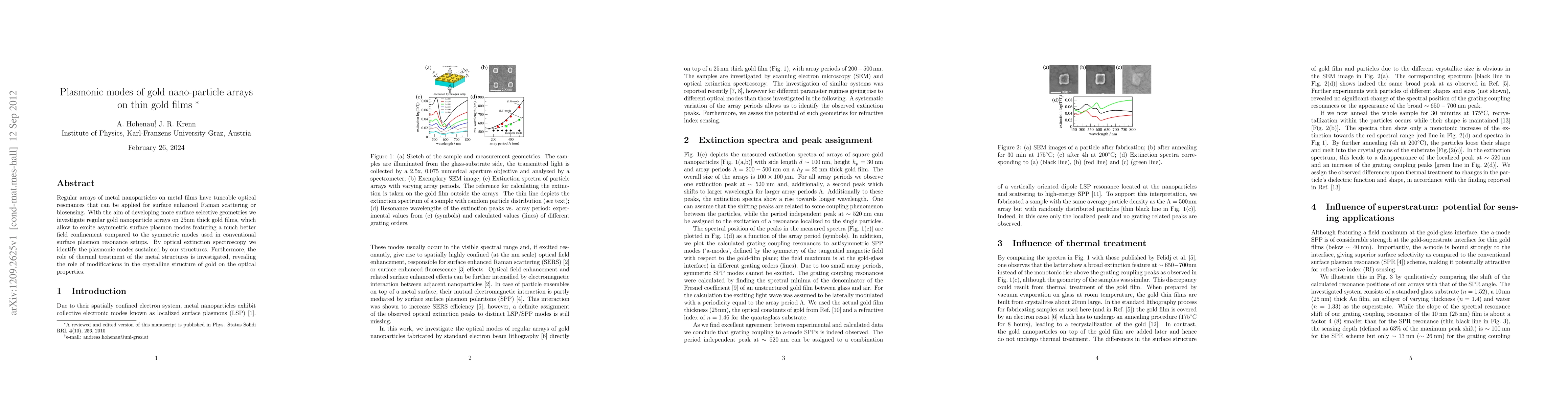 This paper investigates gold nanoparticle arrays on thin gold films to excite asymmetric surface plasmon modes, achieving better field confinement than symmetric modes. Optical extinction spectroscopy identifies these modes, and thermal treatment's impact on the gold crystalline structure and optical properties is also explored.