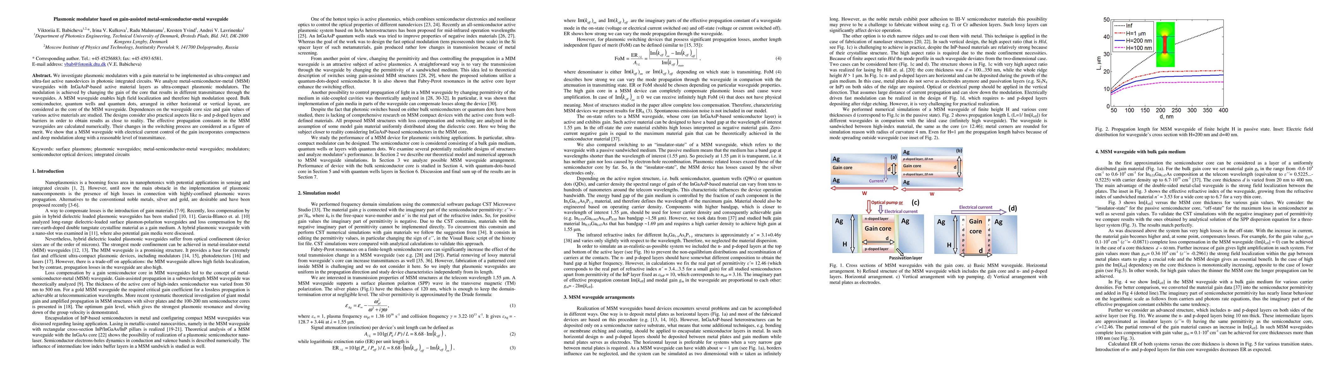 This paper explores ultra-compact and ultra-fast plasmonic modulators using metal-semiconductor-metal (MSM) waveguides with InGaAsP-based gain materials. The modulation is achieved by altering the gain, resulting in varied transmittance, and the MSM waveguides demonstrate high field localization and speed.