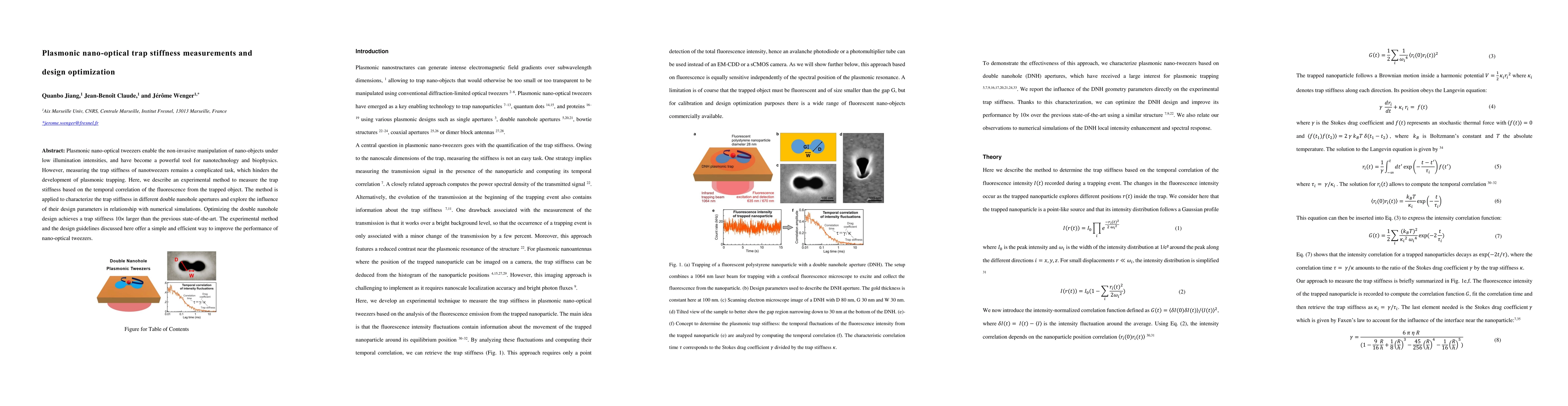 This paper presents an experimental method for measuring the stiffness of plasmonic nano-optical traps using fluorescence temporal correlation, and optimizes double nanohole designs to achieve a 10x increase in trap stiffness compared to previous methods. The findings provide guidelines for enhancing the performance of nano-optical tweezers.