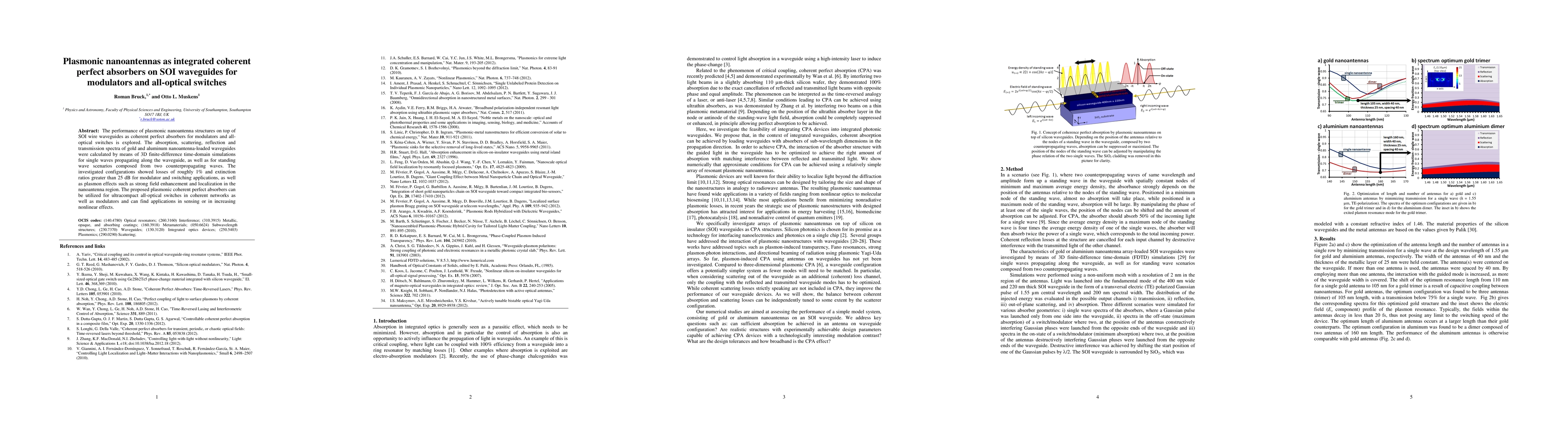 This paper explores the use of plasmonic nanoantennas on silicon-on-insulator (SOI) waveguides as coherent perfect absorbers for modulators and all-optical switches, demonstrating strong field enhancement and losses of about 1% with extinction ratios exceeding 25 dB. The study suggests these nanoantennas can enable ultracompact devices for coherent networks and sensing applications.