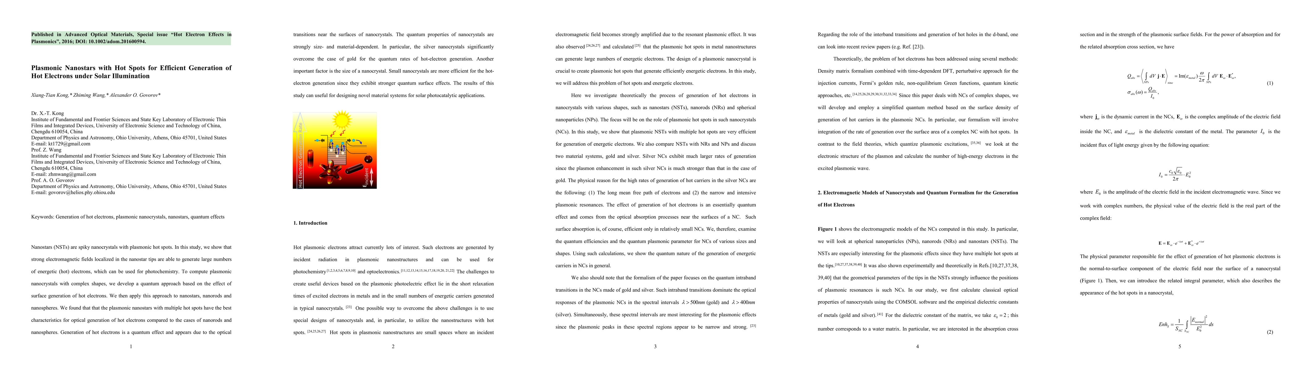This paper explores the generation of hot electrons in plasmonic nanostars under solar illumination, demonstrating that nanostars with multiple hot spots outperform nanorods and nanospheres in this process. The study employs a quantum approach to analyze the quantum effects of nanocrystals, finding that silver nanostars are superior to gold in generating hot electrons, especially smaller nanocrystals due to stronger quantum surface effects.
