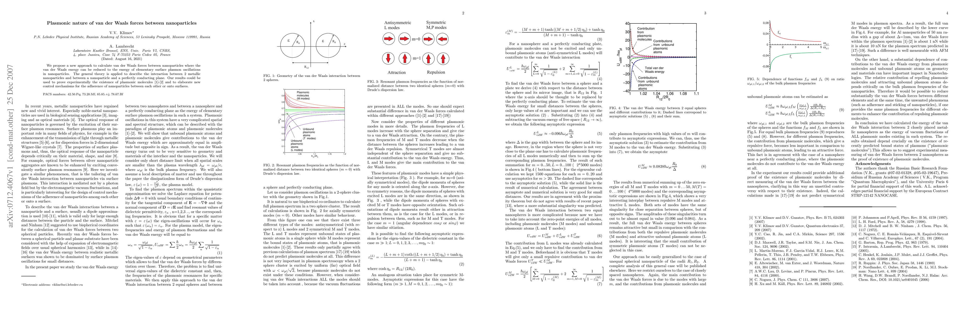 This paper proposes a novel method to calculate van der Waals forces between nanoparticles by relating them to the energy of surface plasmon oscillations. It applies the theory to interactions between metallic nanoparticles and a conducting plane, suggesting potential for proving the existence of plasmonic molecules and developing new nanoparticle adherence control mechanisms.
