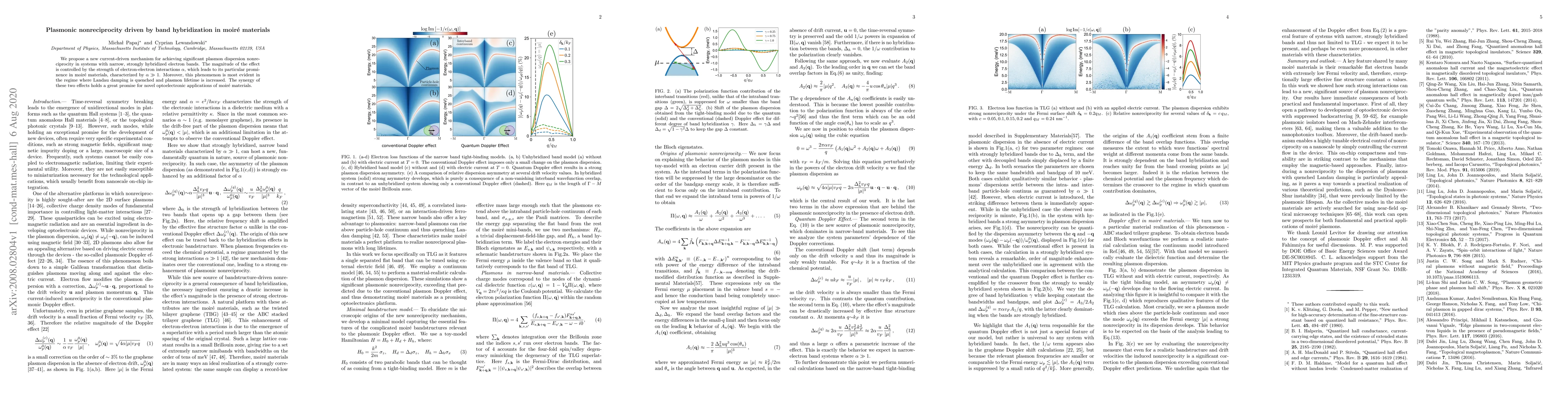 This paper proposes a mechanism for achieving significant plasmon dispersion nonreciprocity in moiré materials through current-driven band hybridization, with the effect's magnitude controlled by strong electron-electron interactions. The phenomenon is most pronounced when Landau damping is minimized, promising new optoelectronic applications.