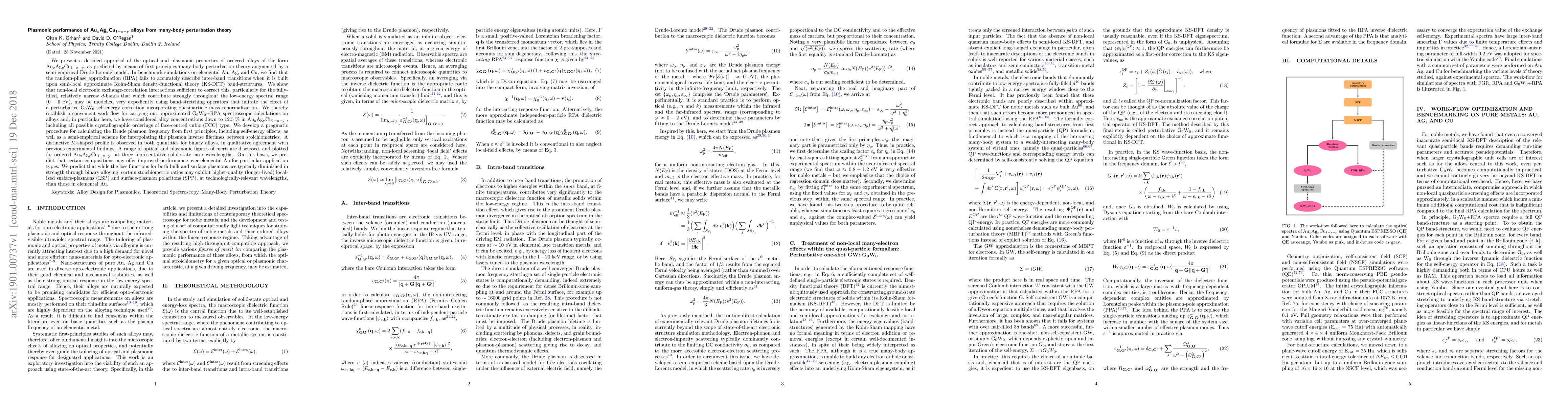 This paper evaluates the optical and plasmonic properties of Au$_\mathbf{x}$Ag$_\mathbf{y}$Cu$_\mathbf{1-x-y}$ alloys using many-body perturbation theory and a semi-empirical Drude-Lorentz model, proposing a workflow for G$_0$W$_0$+RPA calculations and presenting first-principles methods for plasmon frequency and inverse lifetime interpolation.