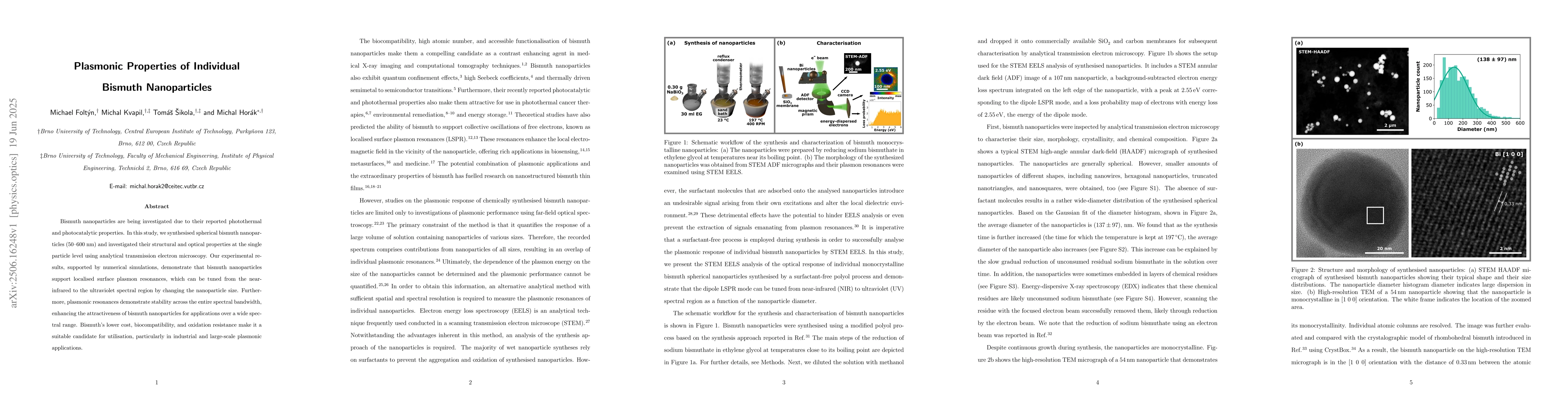 This study synthesizes spherical bismuth nanoparticles and, using advanced microscopy and simulations, discovers they exhibit tunable localized surface plasmon resonances spanning near-infrared to ultraviolet. Bismuth's low cost, biocompatibility, and resistance make it ideal for industrial plasmonic applications.