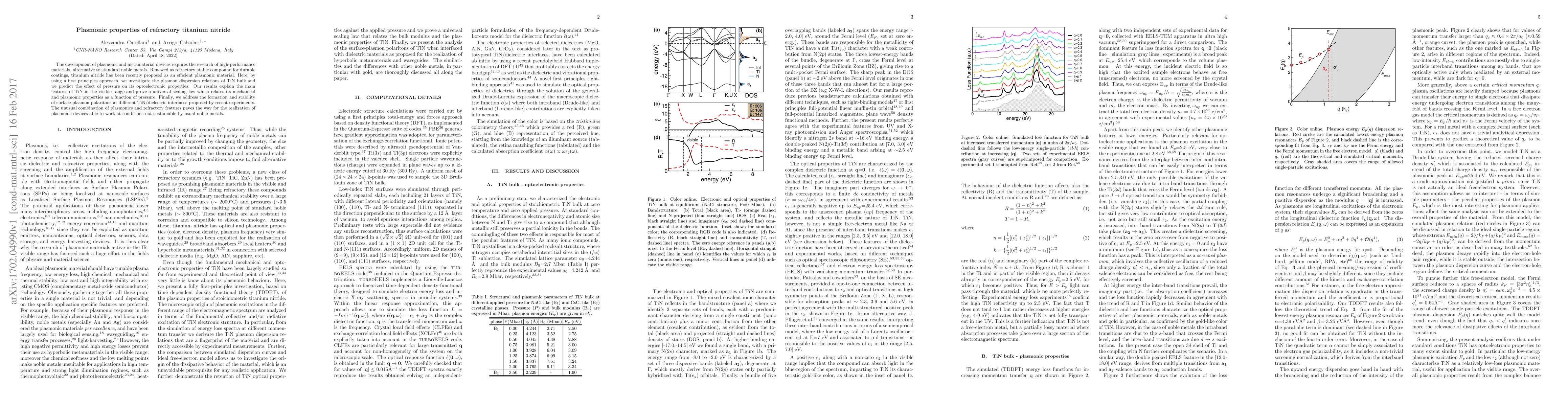 The development of plasmonic and metamaterial devices requires the research of high-performance materials, alternative to standard noble metals. Renewed as refractory stable compound for durable coatings, titanium nitride has been recently proposed as an efficient plasmonic material. Here, by using a first principles approach, we investigate the plasmon dispersion relations of TiN bulk and we predict the effect of pressure on its optoelectronic properties. Our results explain the main features of TiN in the visible range and prove a universal scaling law which relates its mechanical and plasmonic properties as a function of pressure. Finally, we address the formation and stability of surface-plasmon polaritons at different TiN/dielectric interfaces proposed by recent experiments. The unusual combination of plasmonics and refractory features paves the way for the realization of plasmonic devices able to work at conditions not sustainable by usual noble metals.