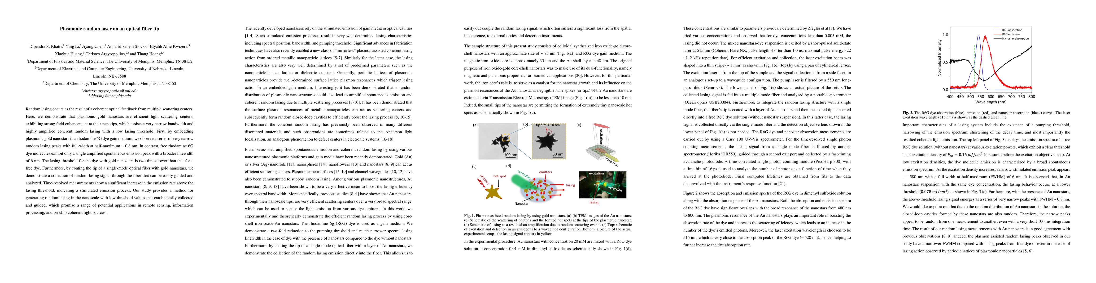 The research demonstrates plasmonic random lasing on an optical fiber tip using gold nanostars as efficient light scattering centers in a rhodamine 6G dye gain medium, with time-resolved measurements to indicate stimulated emission.