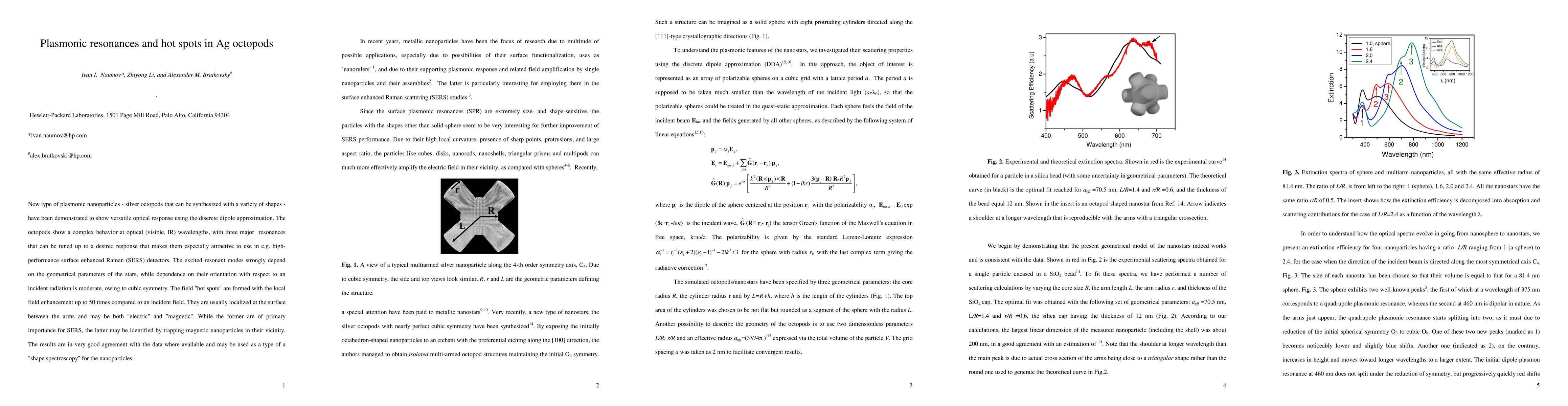 New type of plasmonic nanoparticles - silver octopods that can be synthesized with a variety of shapes - have been demonstrated to show versatile optical response using the discrete dipole approximation. The octopods show a complex behavior at optical (visible, IR) wavelengths, with three major resonances that can be tuned up to a desired response that makes them especially attractive to use in e.g. high-performance surface enhanced Raman (SERS) detectors. The excited resonant modes strongly depend on the geometrical parameters of the stars, while dependence on their orientation with respect to an incident radiation is moderate, owing to cubic symmetry. The field "hot spots" are formed with the local field enhancement up to 50 times compared to an incident field. They are usually localized at the surface between the arms and may be both "electric" and "magnetic". While the former are of primary importance for SERS, the latter may be identified by trapping magnetic nanoparticles in their vicinity. The results are in very good agreement with the data where available and may be used as a type of a "shape spectroscopy" for the nanoparticles.