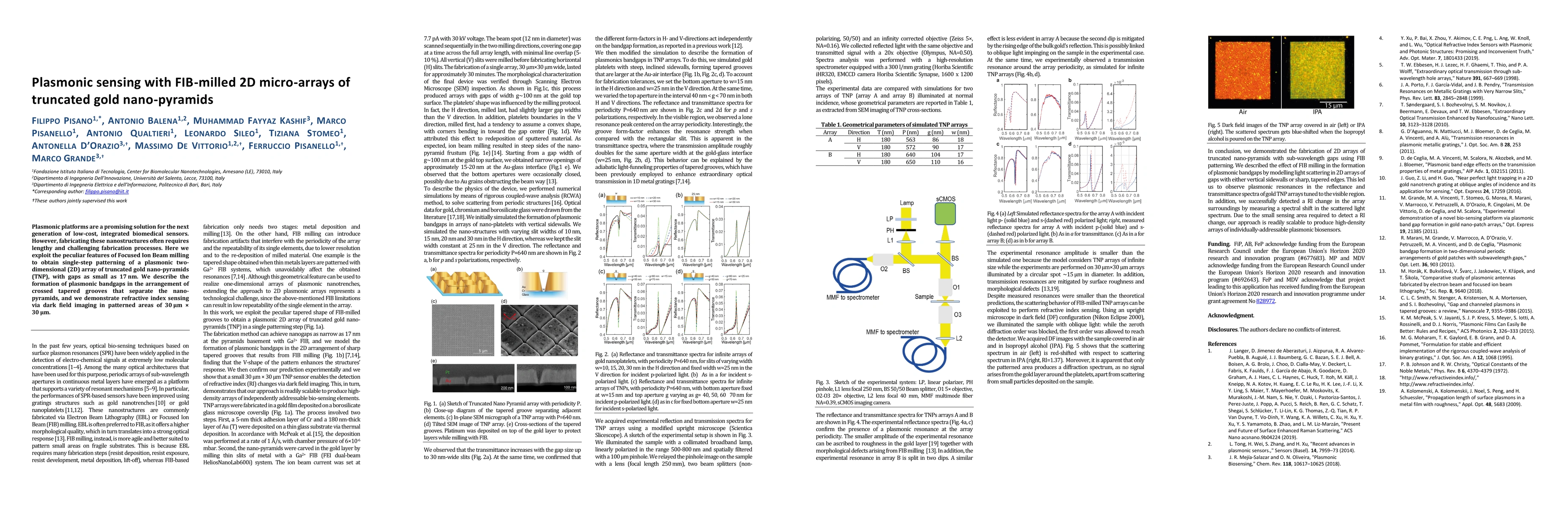 Plasmonic platforms are a promising solution for the next generation of low-cost, integrated biomedical sensors. However, fabricating these nanostructures often requires lengthy and challenging fabrication processes. Here we exploit the peculiar features of Focused Ion Beam milling to obtain single-step patterning of a plasmonic two-dimensional (2D) array of truncated gold nano-pyramids (TNP), with gaps as small as 17 nm. We describe the formation of plasmonic bandgaps in the arrangement of crossed tapered grooves that separate the nano-pyramids, and we demonstrate refractive index sensing via dark field imaging in patterned areas of 30 $\mu$m $\times$ 30 $\mu$m.