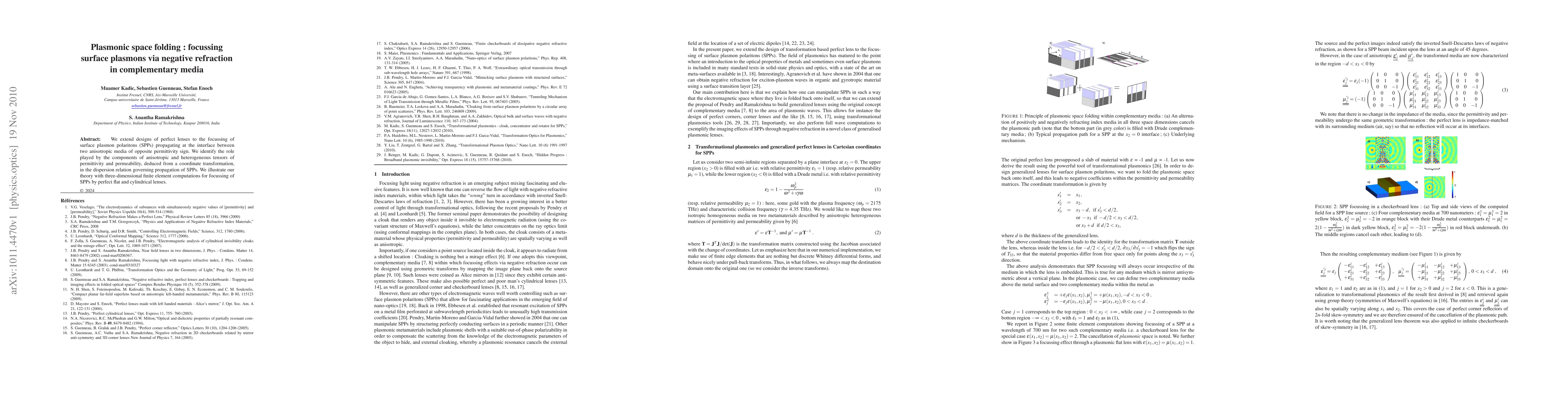 We extend designs of perfect lenses to the focussing of surface plasmon polaritons (SPPs) propagating at the interface between two anisotropic media of opposite permittivity sign. We identify the role played by the components of anisotropic and heterogeneous tensors of permittivity and permeability, deduced from a coordinate transformation, in the dispersion relation governing propagation of SPPs. We illustrate our theory with three-dimensional finite element computations for focussing of SPPs by perfect flat and cylindrical lenses.