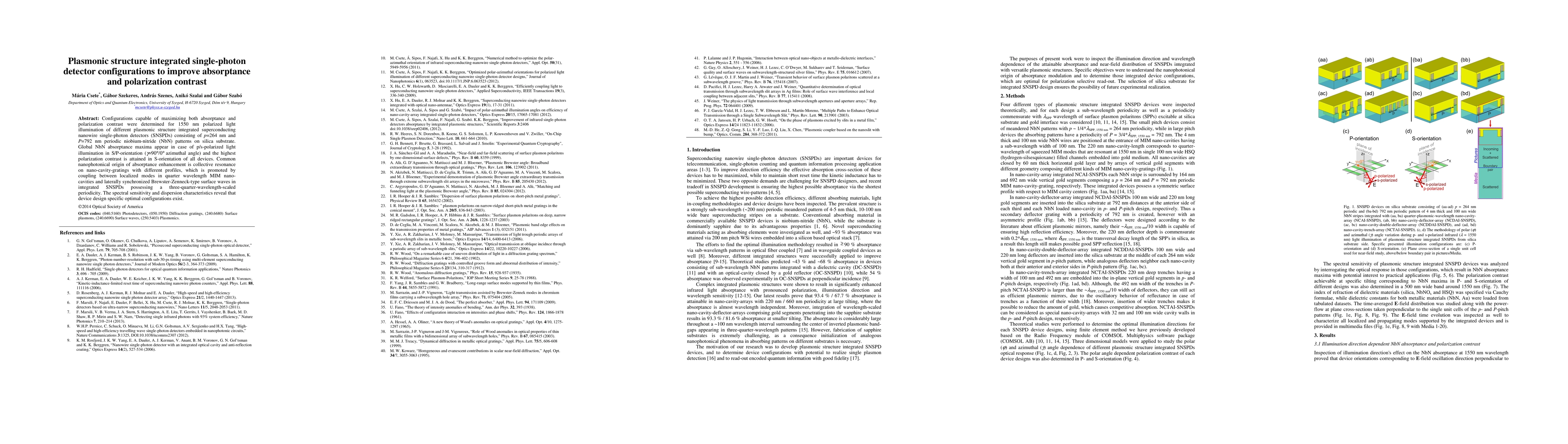 Configurations capable of maximizing both absorptance and polarization contrast were determined for 1550 nm polarized light illumination of different plasmonic structure integrated superconducting nanowire single-photon detectors (SNSPDs) consisting of p=264 nm and P=792 nm periodic niobium-nitride (NbN) patterns on silica substrate. Global NbN absorptance maxima appear in case of p/s-polarized light illumination in S/P-orientation (gamma=90 azimuthal angle) and the highest polarization contrast is attained in S-orientation of all devices. Common nanophotonical origin of absorptance enhancement is collective resonance on nano-cavity-gratings with different profiles, which is promoted by coupling between localized modes in quarter wavelength MIM nano-cavities and laterally synchronized Brewster-Zenneck-type surface waves in integrated SNSPDs possessing a three-quarter-wavelength-scaled periodicity. The spectral sensitivity and dispersion characteristics reveal that device design specific optimal configurations exist.