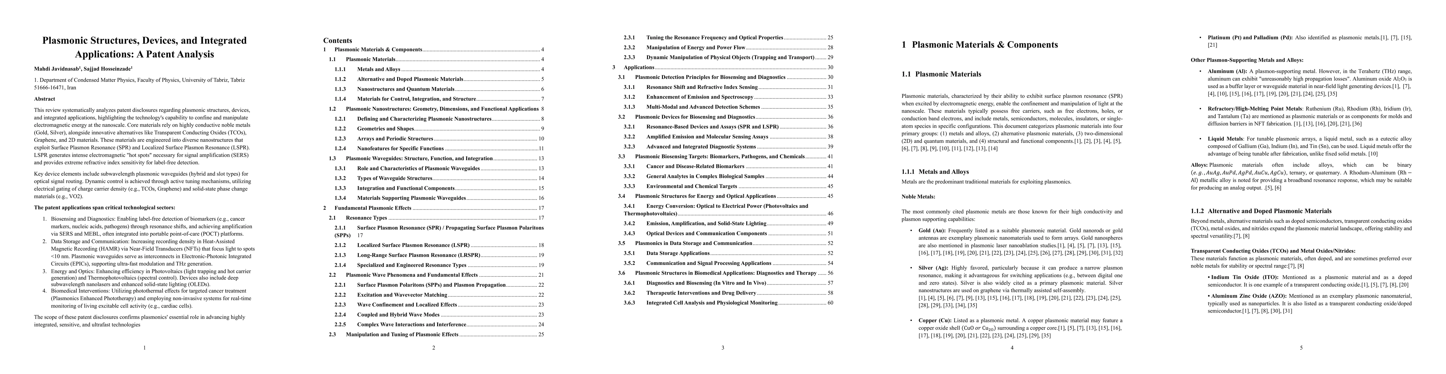This review systematically analyzes patent disclosures regarding plasmonic structures, devices, and integrated applications, highlighting the technology's capability to confine and manipulate electromagnetic energy at the nanoscale. Core materials rely on highly conductive noble metals (Gold, Silver), alongside innovative alternatives like Transparent Conducting Oxides (TCOs), Graphene, and 2D materials. These materials are engineered into diverse nanostructures that exploit Surface Plasmon Resonance (SPR) and Localized Surface Plasmon Resonance (LSPR). LSPR generates intense electromagnetic "hot spots" necessary for signal amplification (SERS) and provides extreme refractive index sensitivity for label-free detection. Key device elements include subwavelength plasmonic waveguides (hybrid and slot types) for optical signal routing. Dynamic control is achieved through active tuning mechanisms, utilizing electrical gating of charge carrier density (e.g., TCOs, Graphene) and solid-state phase change materials (e.g., VO2).