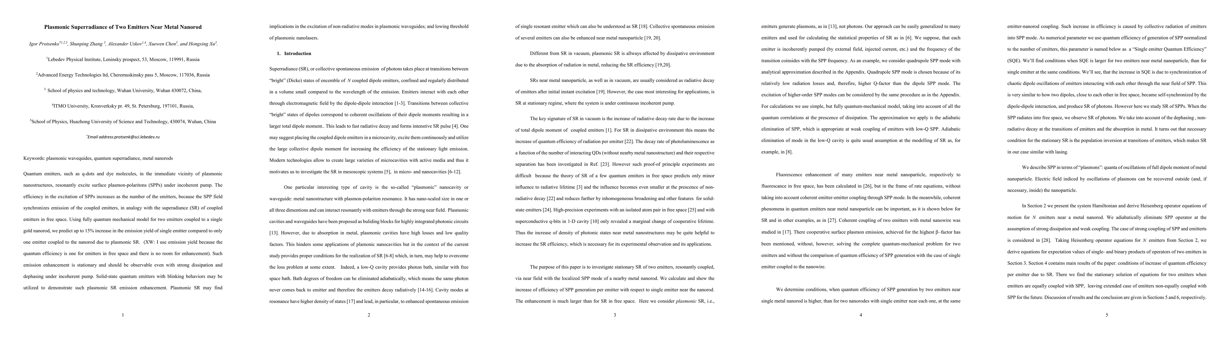Predicts and demonstrates the existence of plasmonic SR emission enhancement due to synchronized emission of coupled emitters