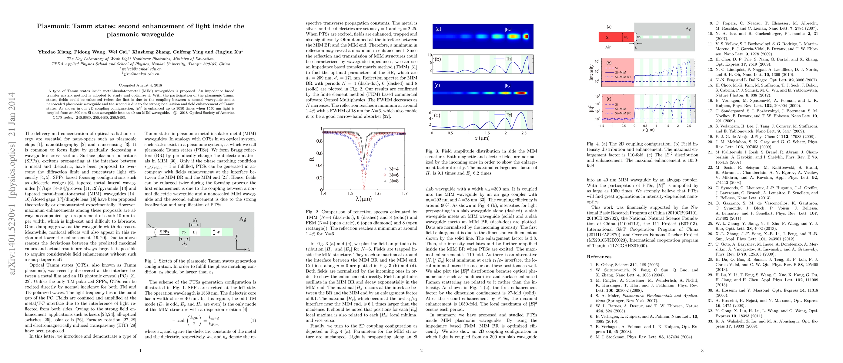 This research proposes a new type of Tamm states within metal-insulator-metal waveguides, optimizing them using an impedance-based transfer matrix method. The plasmonic Tamm states double the enhancement of light fields, first through coupling between normal and nanoscale plasmonic waveguides and second via strong localization effects, achieving up to 1050 times enhancement of the electric field intensity.