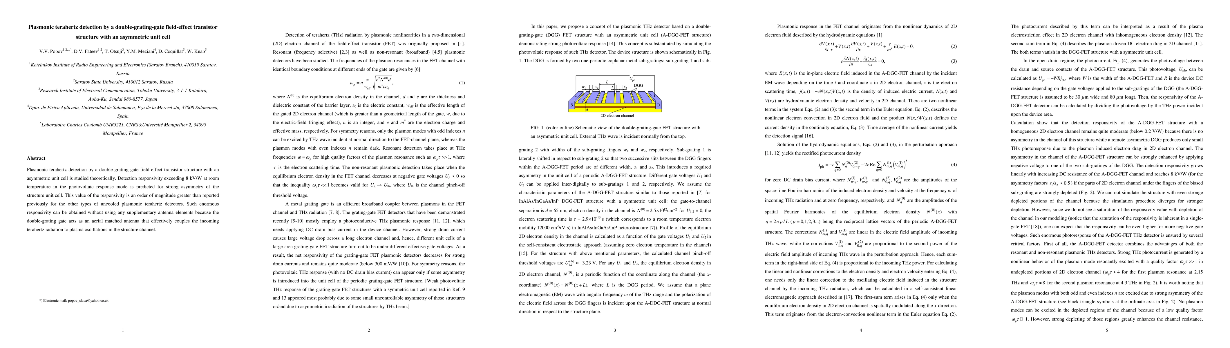 This paper theoretically investigates a double-grating gate field-effect transistor with an asymmetric unit cell for plasmonic terahertz detection, predicting a responsivity of over 8 kV/W at room temperature, significantly higher than previous detectors. The high responsivity is achieved without additional antennas due to the effective coupling of terahertz radiation by the double-grating gate.