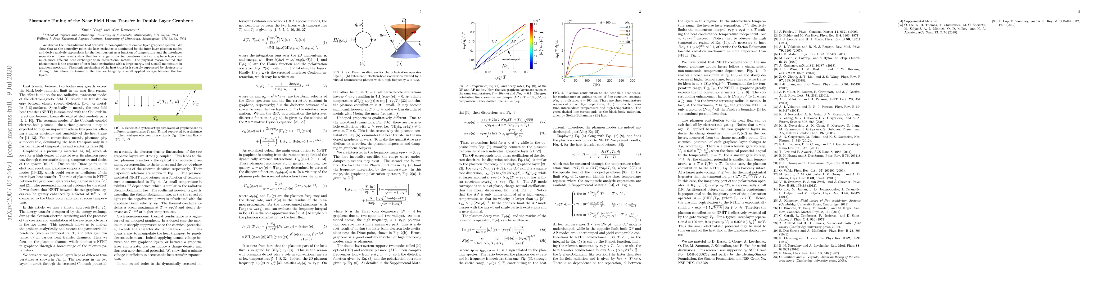 This paper investigates non-radiative heat transfer in a non-equilibrium double layer graphene system, demonstrating that inter-layer plasmon modes dominate heat exchange at the neutrality point. The study reveals that graphene layers are superior heat exchangers than conventional metals at low temperatures due to inter-band excitations, and electrostatic doping can tune heat exchange via applied voltage.