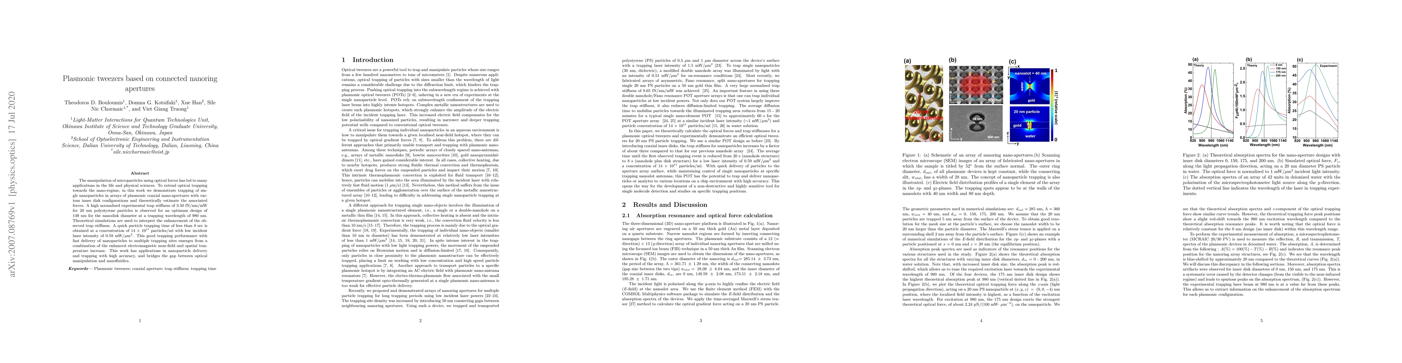 The manipulation of microparticles using optical forces has led to many applications in the life and physical sciences. To extend optical trapping towards the nano-regime, in this work we demonstrate trapping of single nanoparticles in arrays of plasmonic coaxial nano-apertures with various inner disk configurations and theoretically estimate the associated forces. A high normalised experimental trap stiffness of 3.50fN/nm/mW for 20nm polystyrene particles is observed for an optimum design of 149nm for the nanodisk diameter at a trapping wavelength of 980nm. Theoretical simulations are used to interpret the enhancement of the observed trap stiffness. A quick particle trapping time of less than 8sec is obtained at a concentration of 14$\times$10$^{11}$ particles/ml with low incident laser intensity of 0.59mW/$\mu$m$^{2}$. This good trapping performance with fast delivery of nanoparticles to multiple trapping sites emerges from a combination of the enhanced electromagnetic near-field and spatial temperature increase. This work has applications in nanoparticle delivery and trapping with high accuracy, and bridges the gap between optical manipulation and nanofluidics.