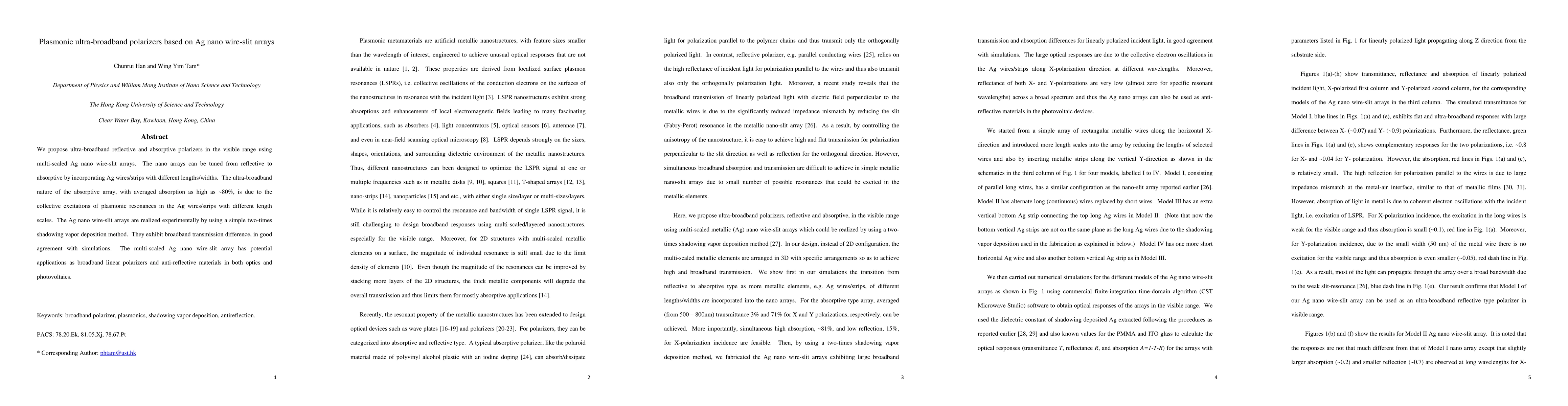 This research introduces ultra-broadband reflective and absorptive polarizers using Ag nano wire-slit arrays, demonstrating high absorption rates through plasmonic resonances. The arrays are fabricated via a simple vapor deposition method and show promising applications in optics and photovoltaics.