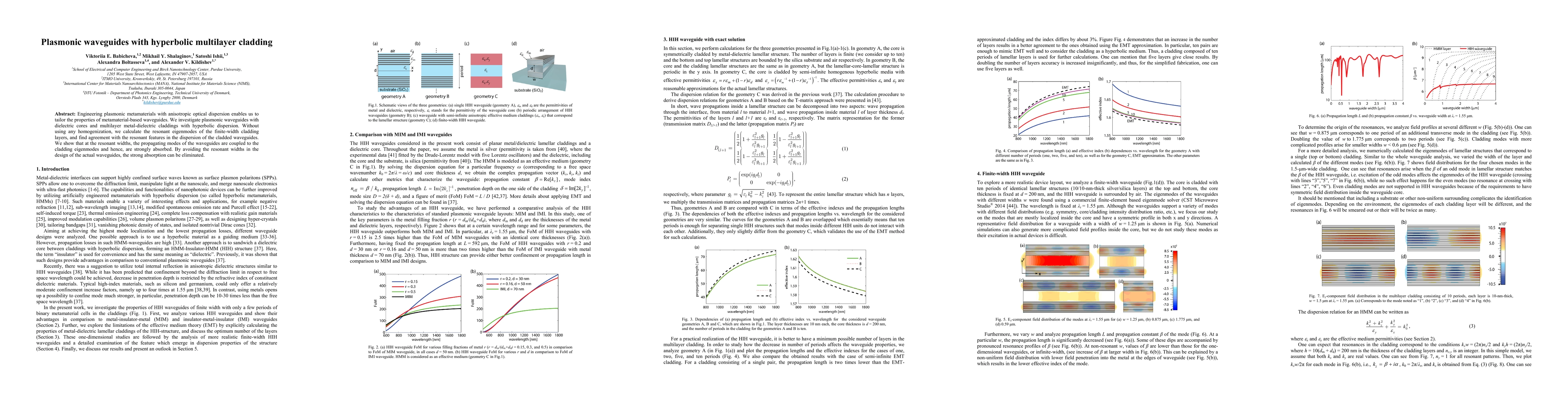The research investigates plasmonic waveguides with dielectric cores and multilayer metal-dielectric claddings featuring hyperbolic dispersion. It calculates resonant eigenmodes of finite-width cladding layers without homogenization, comparing geometries A, B, and C using the T-matrix approach and effective medium theory (EMT) approximations.