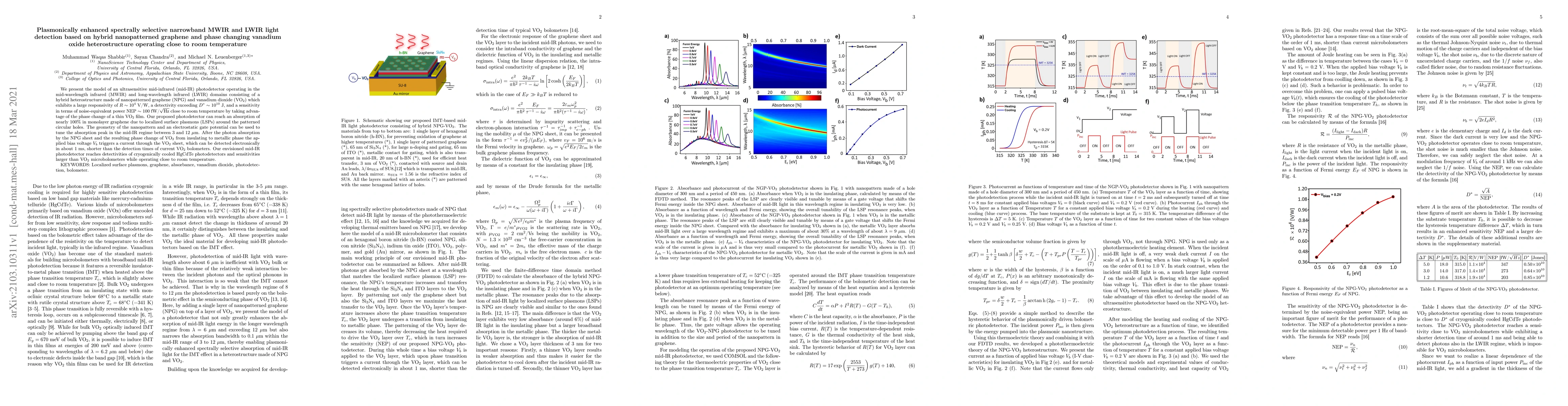 This paper proposes an ultrasensitive mid-infrared photodetector combining nanopatterned graphene and vanadium dioxide, achieving high responsivity and detectivity near room temperature. The device leverages localized surface plasmons and phase change properties for efficient photon absorption and rapid electronic detection.