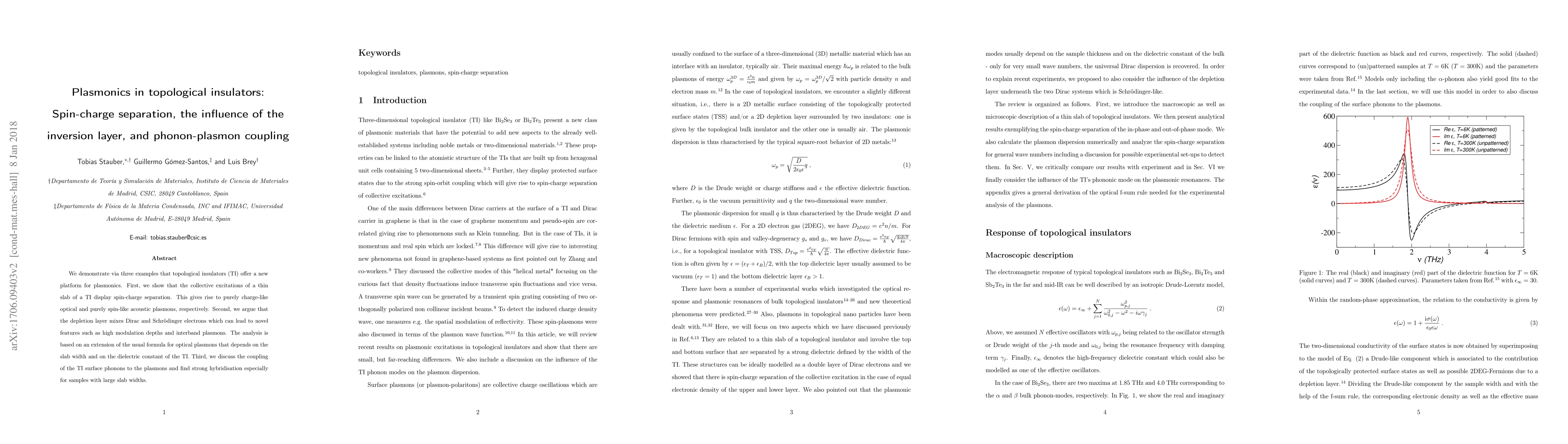 This paper explores the potential of topological insulators (TI) for plasmonic applications, demonstrating spin-charge separation in TI plasmons and the influence of the inversion layer on plasmon properties. It also investigates the strong phonon-plasmon coupling in TI, particularly in wide slab samples.