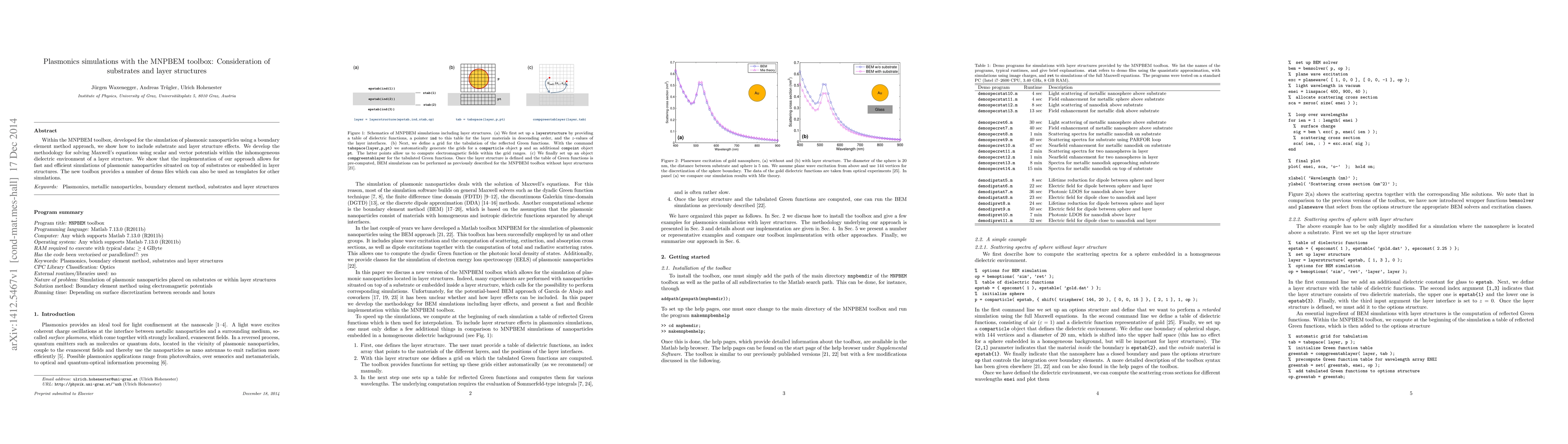 This paper introduces the MNPBEM toolbox for simulating plasmonic nanoparticles using a boundary element method, detailing how to incorporate substrate and layer structure effects. The methodology efficiently solves Maxwell's equations in inhomogeneous dielectric environments, enabling fast simulations of nanoparticles on substrates or within layer structures.