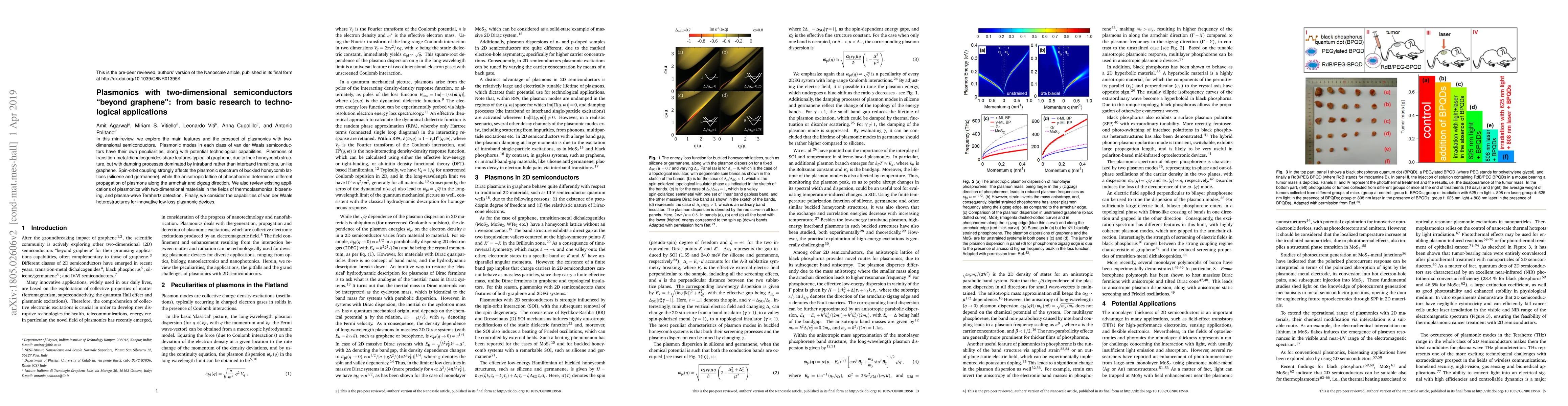 This minireview examines the unique plasmonic properties of various two-dimensional semiconductors beyond graphene and their technological applications, including thermoplasmonics, biosensing, and THz detection. It highlights the distinct plasmonic behaviors influenced by factors like spin-orbit coupling and lattice anisotropy in materials such as transition-metal dichalcogenides, silicene, germanene, and phosphorene.