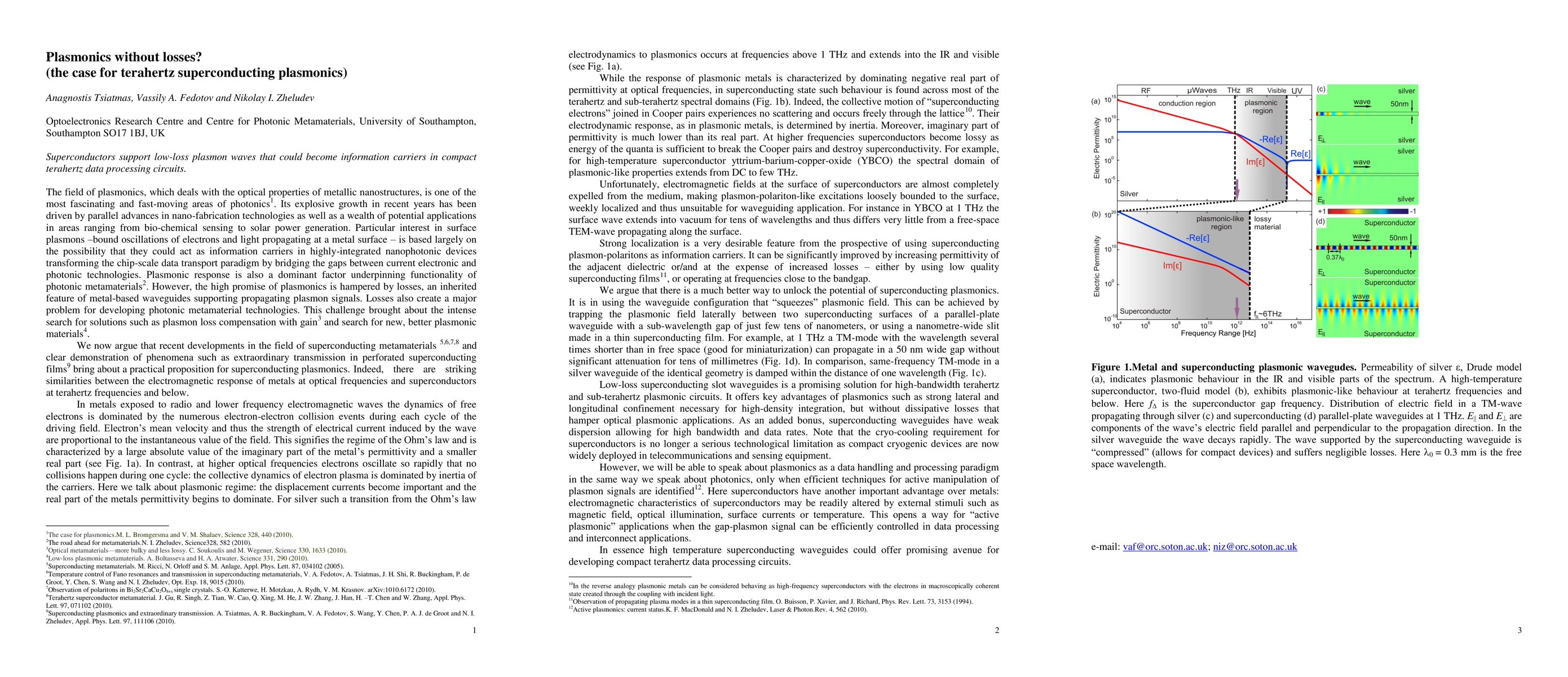 This research explores the potential of superconductors in generating low-loss surface plasmon waves for use in compact terahertz data processing circuits, suggesting a new avenue for high-efficiency information transmission in this frequency range.
