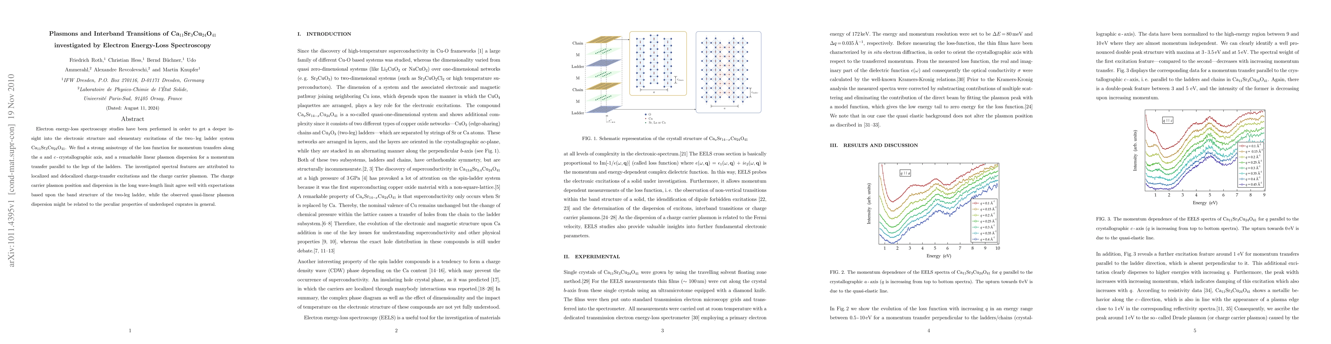 Electron energy-loss spectroscopy studies have been performed in order to get a deeper insight into the electronic structure and elementary excitations of the two-leg ladder system Ca$_{11}$Sr$_3$Cu$_{24}$O$_{41}$. We find a strong anisotropy of the loss function for momentum transfers along the a and c-crystallographic axis, and a remarkable linear plasmon dispersion for a momentum transfer parallel to the legs of the ladders. The investigated spectral features are attributed to localized and delocalized charge-transfer excitations and the charge carrier plasmon. The charge carrier plasmon position and dispersion in the long wave-length limit agree well with expectations based upon the band structure of the two-leg ladder, while the observed quasi-linear plasmon dispersion might be related to the peculiar properties of underdoped cuprates in general.