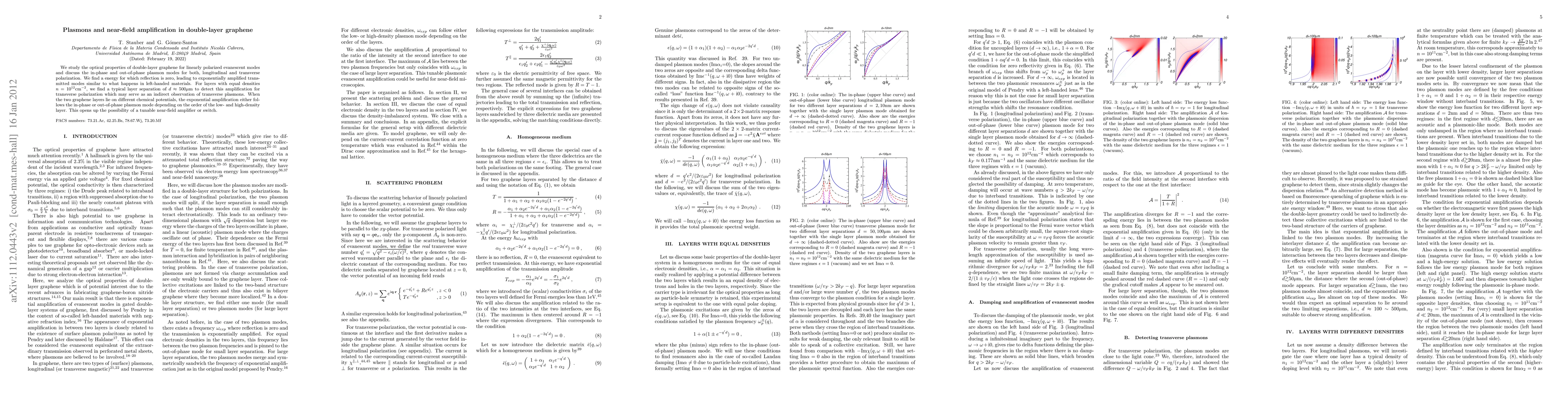 We study the optical properties of double-layer graphene for linearly polarized evanescent modes and discuss the in-phase and out-of-phase plasmon modes for both, longitudinal and transverse polarization. We find a energy for which reflection is zero, leading to exponentially amplified transmitted modes similar to what happens in left-handed materials. For layers with equal densities $n=10^{12}$cm$^{-2}$, we find a typical layer separation of $d\approx500\mu$m to detect this amplification for transverse polarization which may serve as an indirect observation of transverse plasmons. When the two graphene layers lie on different chemical potentials, the exponential amplification either follows the in-phase or out-of-phase plasmon mode depending on the order of the low- and high-density layer. This opens up the possibility of a tunable near-field amplifier or switch.